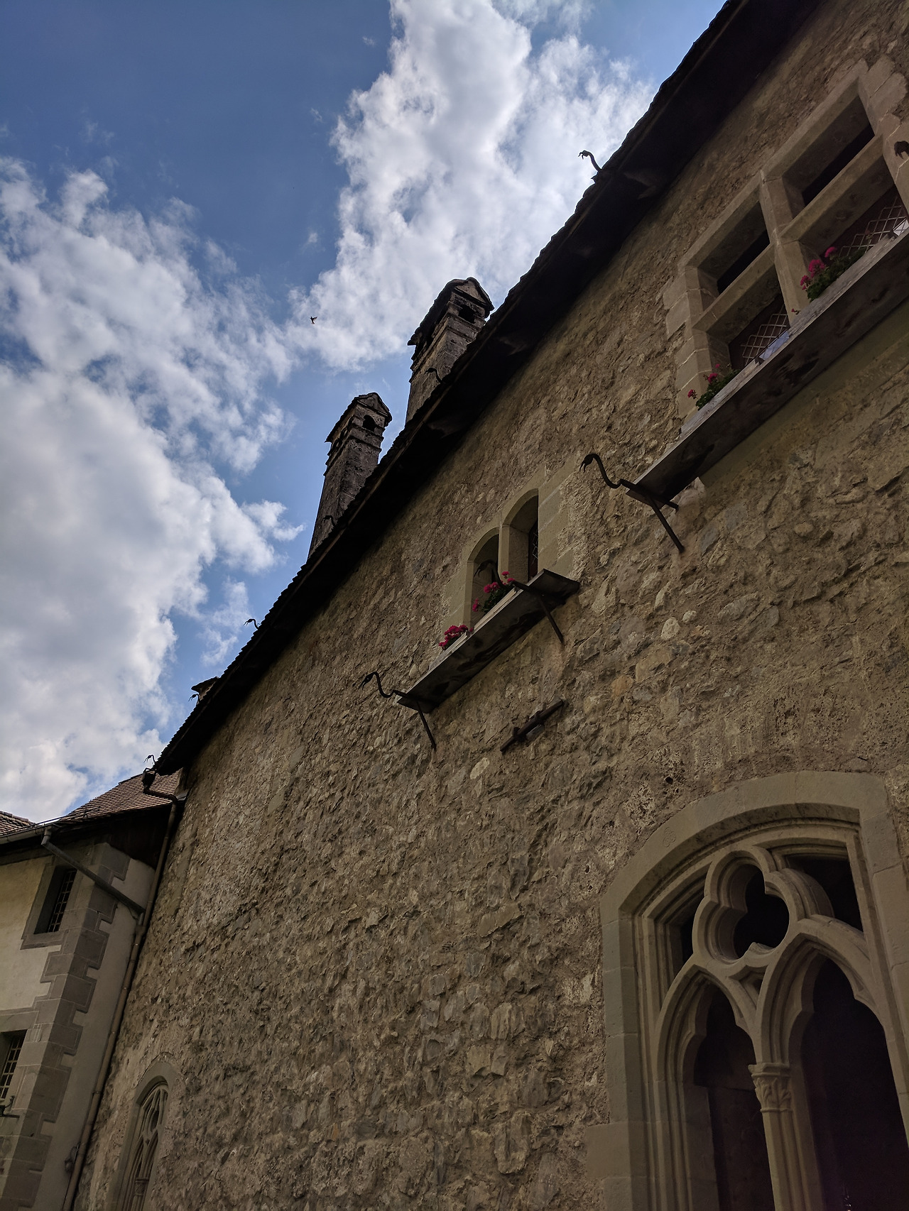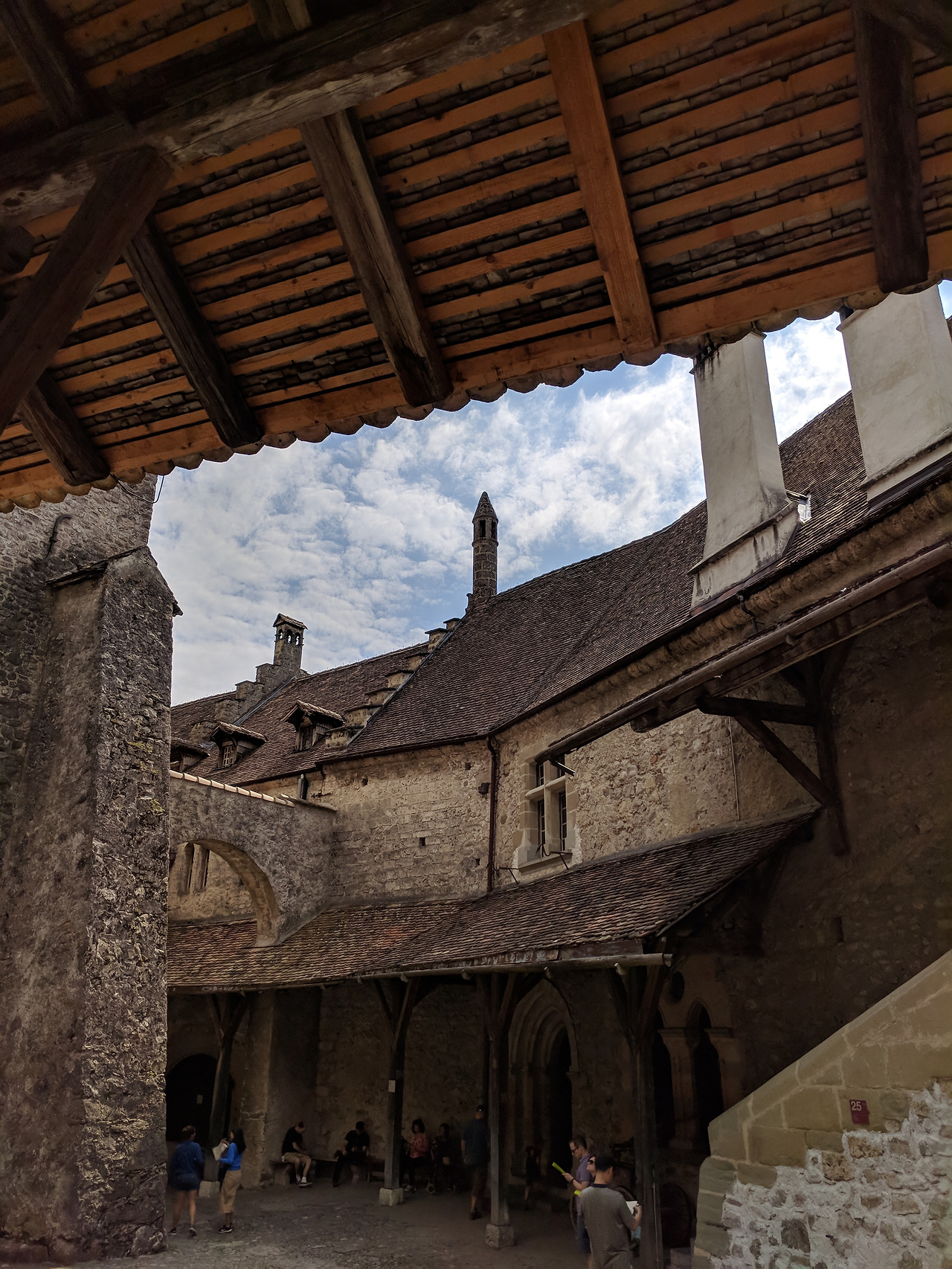 시용성 입구에서 해자와 성채를 잇는 다리를 건너면 성안으로 들어갈 수 있는데, 안내서에 따르며, 육지를 접하고 있는 성채는 적을 방어하는 용도로, 호수에 접해 있는 성채는 주거용으로 사용되었다고 한다. 우리는 버스를 타고 내려 해자와 성채를 잇는 다리를 통해 들어간터라 호수쪽에서 성을 바라보는 뷰는 만끽하지 못했는데, 로잔에서 출발하는 크루즈를 타고 시용성이 도착하는 방법도 있다고 하니, 이 때는 크루즈 선에서 성을 한 눈에 담을 수 있을 것이라 짐작이 된다.