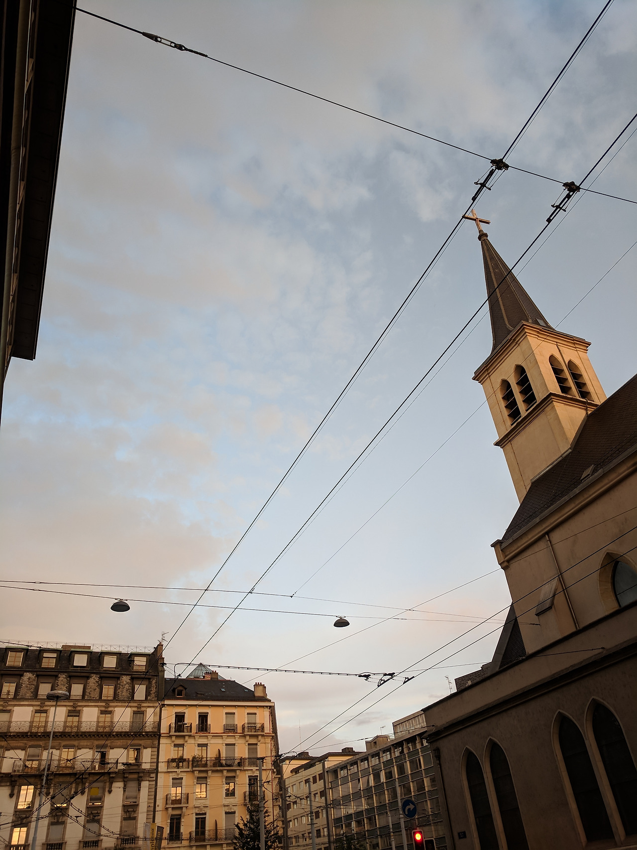 트램을 타고 제네바 곳곳을 누비다, 해가 뉘엿뉘엿 저물기 시작하면, 밝음과 어두움이 싸우는 사이 펼쳐지는 빛의 예술들 긴 트램 거리를 따라 목격할 수 있다. 겨울이면 그 트램 노선을 따라, 크리스마스 장식이 들어서기 때문에 새로운 구경거리가 추가되는데, 기분을 업시키는데 아주 효과가 있다.