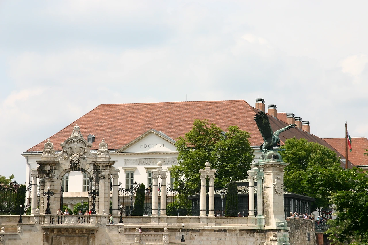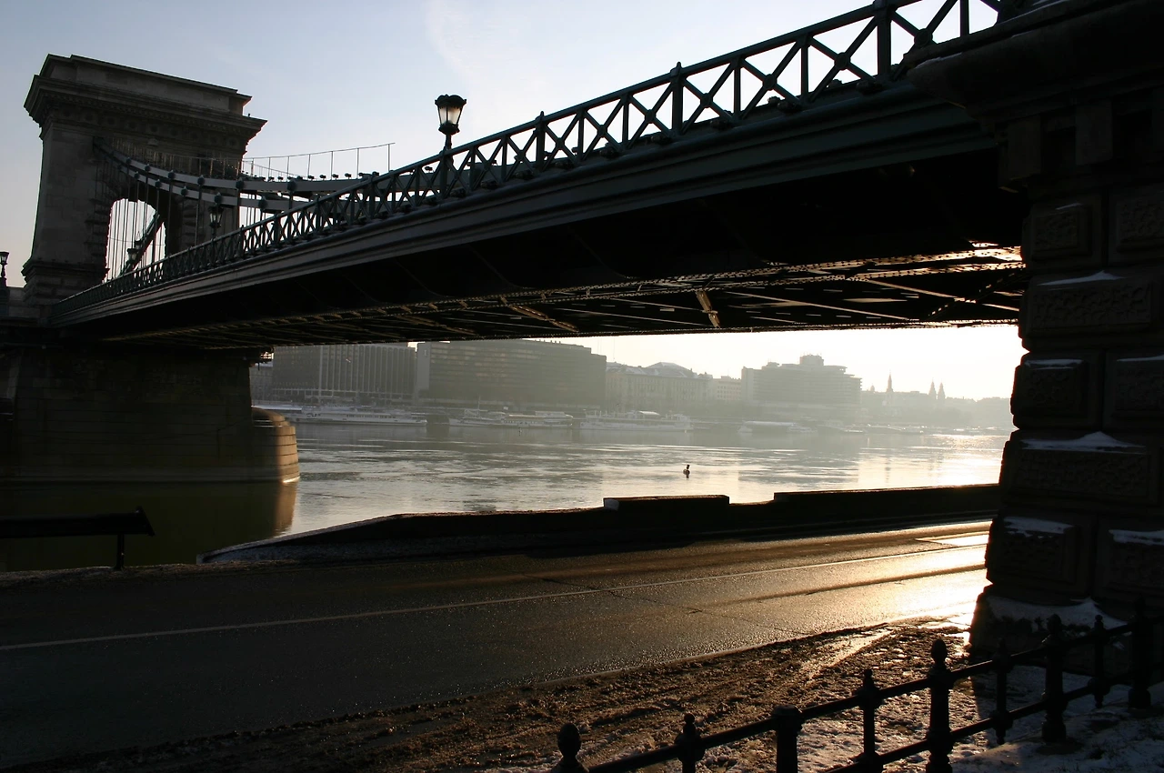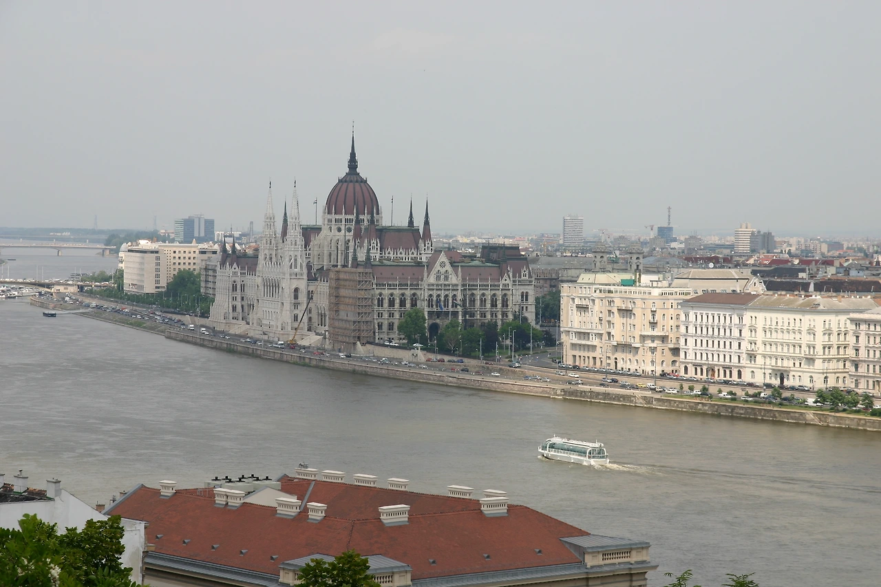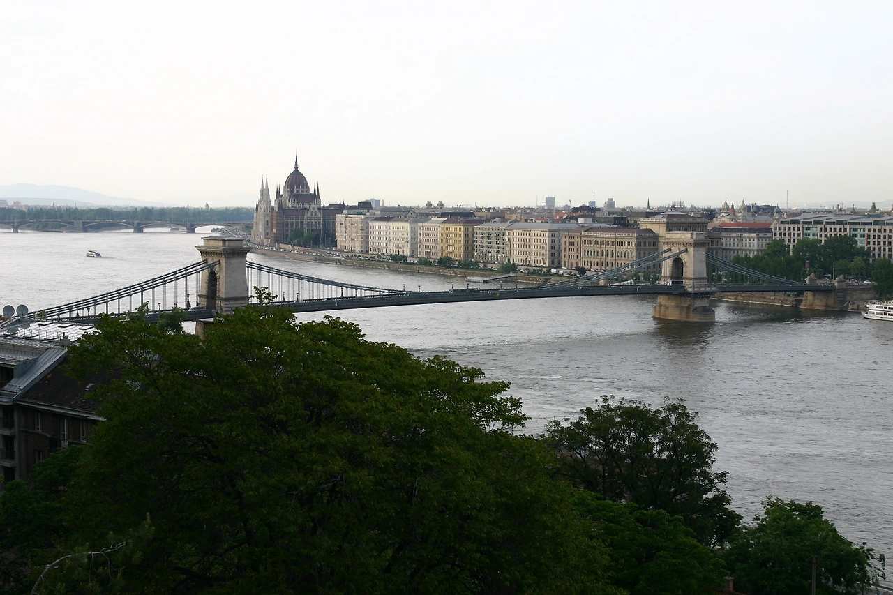 부다 지역에서 바라본 국회의사당. 그 앞으로 부다 지역과 페스트 지역을 연결하는 다리 중 하나인 세체니 다리가 상징적으로 서 있다.