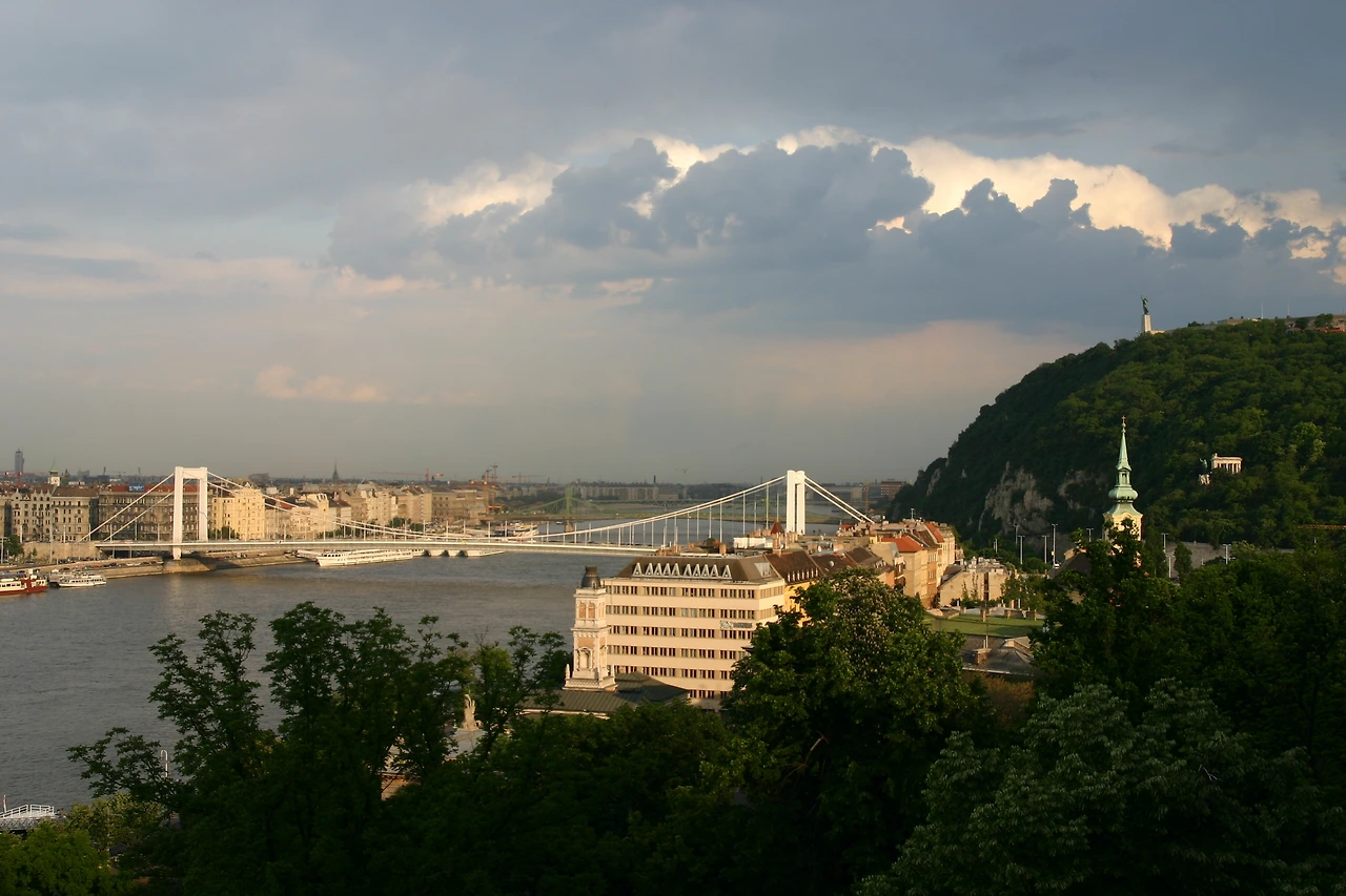 부다 왕궁에서 바라본 겔레르트 언덕과 해방 기념비. 엘리자베스 다리가 길게 드리워져 있다(왼쪽).