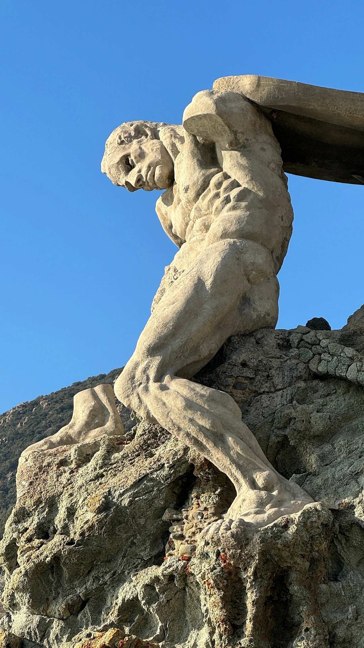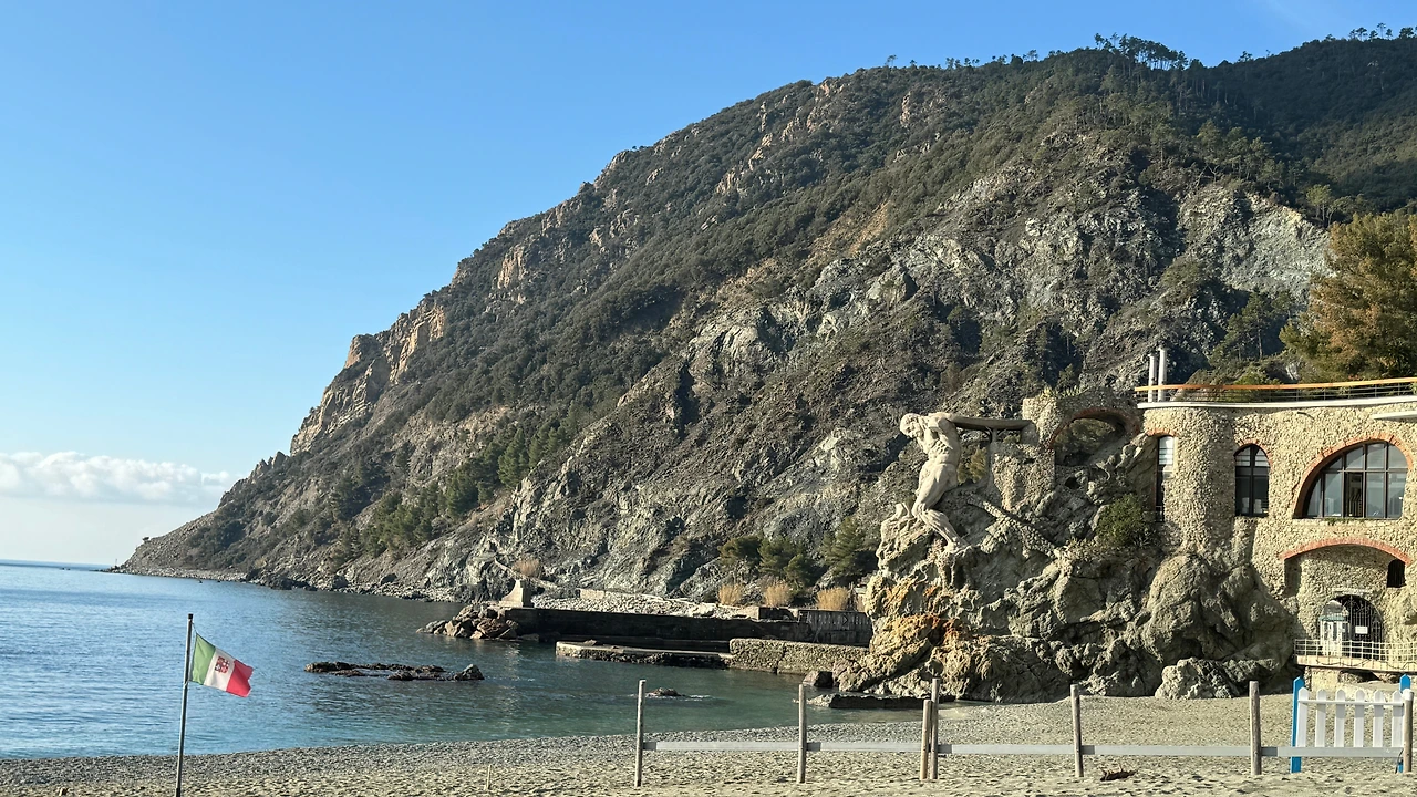그 앞에 다다르니 더 선명하게 다가오는 거대한 작품. Il Gigante (거인)이라는 제목의 작품이라고 한다. 몬테로소 알 마레의 가장 독특하고 인상적인 랜드마크 중 하나라고. Il Gigante는 1910년에 건축가 프란체스코 레비(Francesco Levacher)와 조각가 아루고니니(Arrigo Minerbi)에 의해 만들어졌고, 원래 이 조각상은 넵튠(Neptune) 또는 포세이돈(Poseidon)으로 불리는 바다의 신을 묘사한 것이라고 한다. 조각상은 원래 Villa Pastine이라는 화려한 빌라의 일부로 설계되었다고 하는데 바로 뒤에 빌라가 연결된 것이 선명하게 눈에 띄었다. 14미터 높이에 달하는 이 거대한 석상은 당시 빌라의 테라스를 지탱하는 구조물로 사용되었다고 하는데, 여느 유명한 유럽의 많은 역사적 장소와 조각들 처럼 제2차 세계대전과 여러 차례의 폭풍으로 인해 심각한 손상을 입었고, 여러차례 복원을 거쳐 현재의 모습을 유지하고 있다고. 여전히 일부는 복원되지 않은채로 남겨져 있는데, 모랄까, 아주 완벽한 작품의 형태가 아니어서, 시간의 흔적이 그대로 묻어나는 친퀘테레의 모습과 오히려 묘하게 조화를 이루는 모습이라고 느껴졌다. 폭격을 맞아 손상된 이미지라기 보다는 바다, 자연풍경과 잘 어우러진 모습이 오히려 인상적이라고 해야할 것 같았다. 사이즈가 남달라 호기심을 불러일으키기에도 충분했고, 해변가에 떡하니 버티고 있는 것이 수호신 같은 느낌도 들어 다소 지루할 수 있는 해변에 나름 독특한 분위기를 연출하는 오브제 같다고 해야할까.