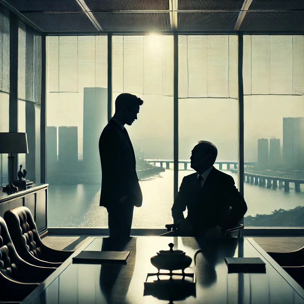 며칠 뒤, B의 사무실 문이 노크도 없이 무례하게 열리며 엄모순이 들어섰다. B는 비밀 서류를 정리하던 중이었다. 엄모순의 눈빛은 이미 사무실 안을 검게 물들이고 있었다.