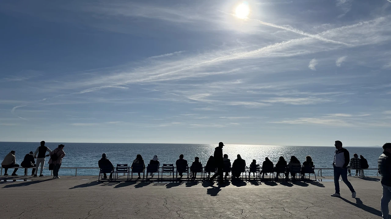 니스의 영국인의 산책로 (프롬나드 데 장글레(Promenade des Anglais))의 유명한 파란 의자와 사람들입니다. 역광이라 파란색으로 보이지 않지만 맞습니다^^