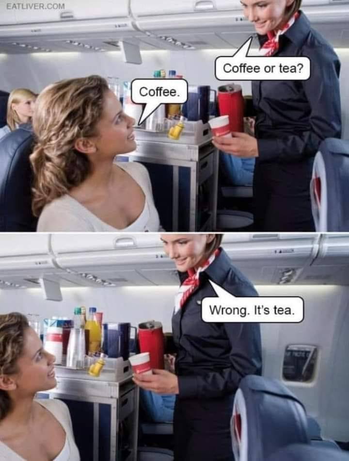 플라이트 어텐던트는 해석 2로 질문을 한 것으로 설정한 것이 유머의 포인트인데, 보통 비행기에는 해석 1로 질문을 하고 또 그렇게 이해하지요(당연히 손님은 이렇게 이해) ^^ 유머가 상당한 flight attendant 되시겠습니다 ^^
