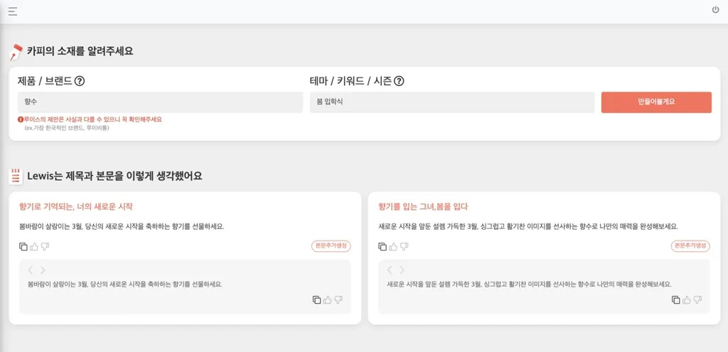 첫째, 한국어 처리 능력입니다. 한국어 기반 모델인 HyperCLOVA X를 활용함으로써 퀄리티 높은 한국어 문장을 구사할 수 있었습니다. 마케팅 카피는 소비자의 마음을 움직여야 하는데, 정확한 한국어 표현이 무엇보다 중요합니다.