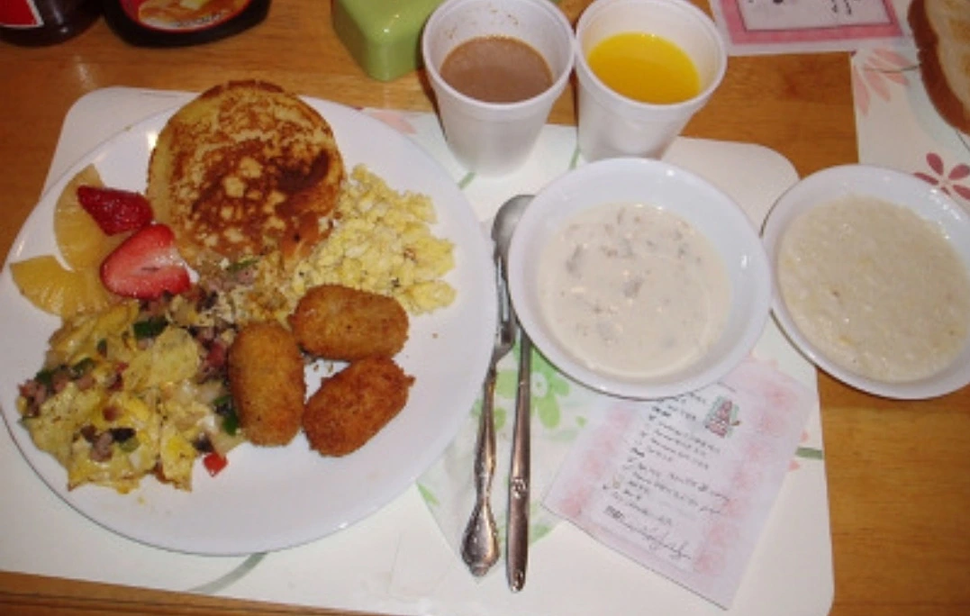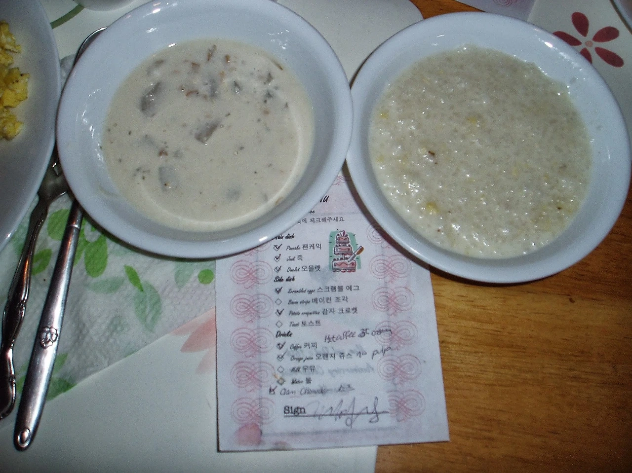 메뉴판의 메뉴는 팬케익, 잣죽, 오믈렛, 스크램블에그, 베이컨, 감자크로켓, 토스트, 크램 차우더.