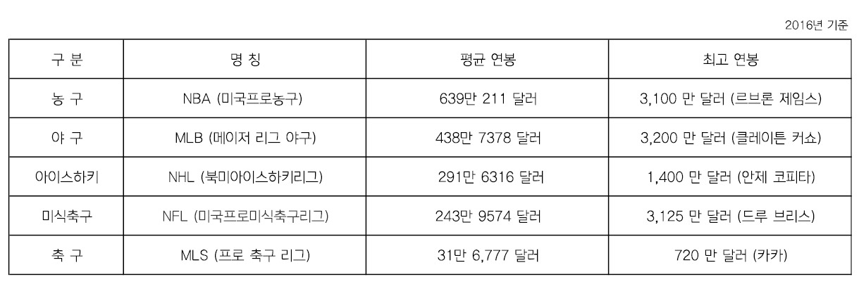 참고로 4대 종목과 축구와의 연봉 수준을 비교해 봤다. 아래 표에 따르면 돈과 명성으로만 판단한다면 굳이 이 나라에서 축구를 한다는 게 어떤 것인지 쉽게 알 수 있다. (구글 검색을 통해 분산된 개별자료를 하나로 정리하였음)