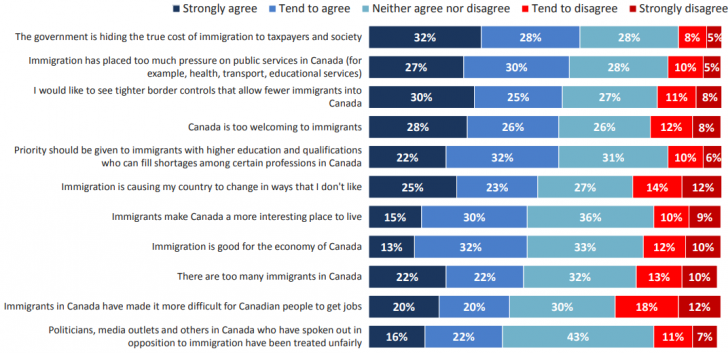 특이할 만한 점은 이민자로 인해 원하지 않는 방향으로 캐나다가 바뀌고 있다는 질문에 48% 대 25%로 부정적 인식이 강했으며, 캐나다에 이민자가 너무 많다는 질문에 44%가 그렇다고 대답해 아니다는 24%에 비해 두 배 가까웠다. 너무 이민자를 환대한다는 질문에도 54% 대 20%로 나타났다. 결국 이민자의 천국, 마냥 사람 좋을 것 같은 캐나다 사람들도 겉으로 드러내지 않았지만 이민자에 대해 부정적인 인식이 잠재해 있다는 것을 확인할 수 있다. (자세한 내용은 https://www.ipsos.com/en-ca/news-polls/canadians-nervous-about-impact-of-immigration-on-canada에서 확인할 수 있다.)