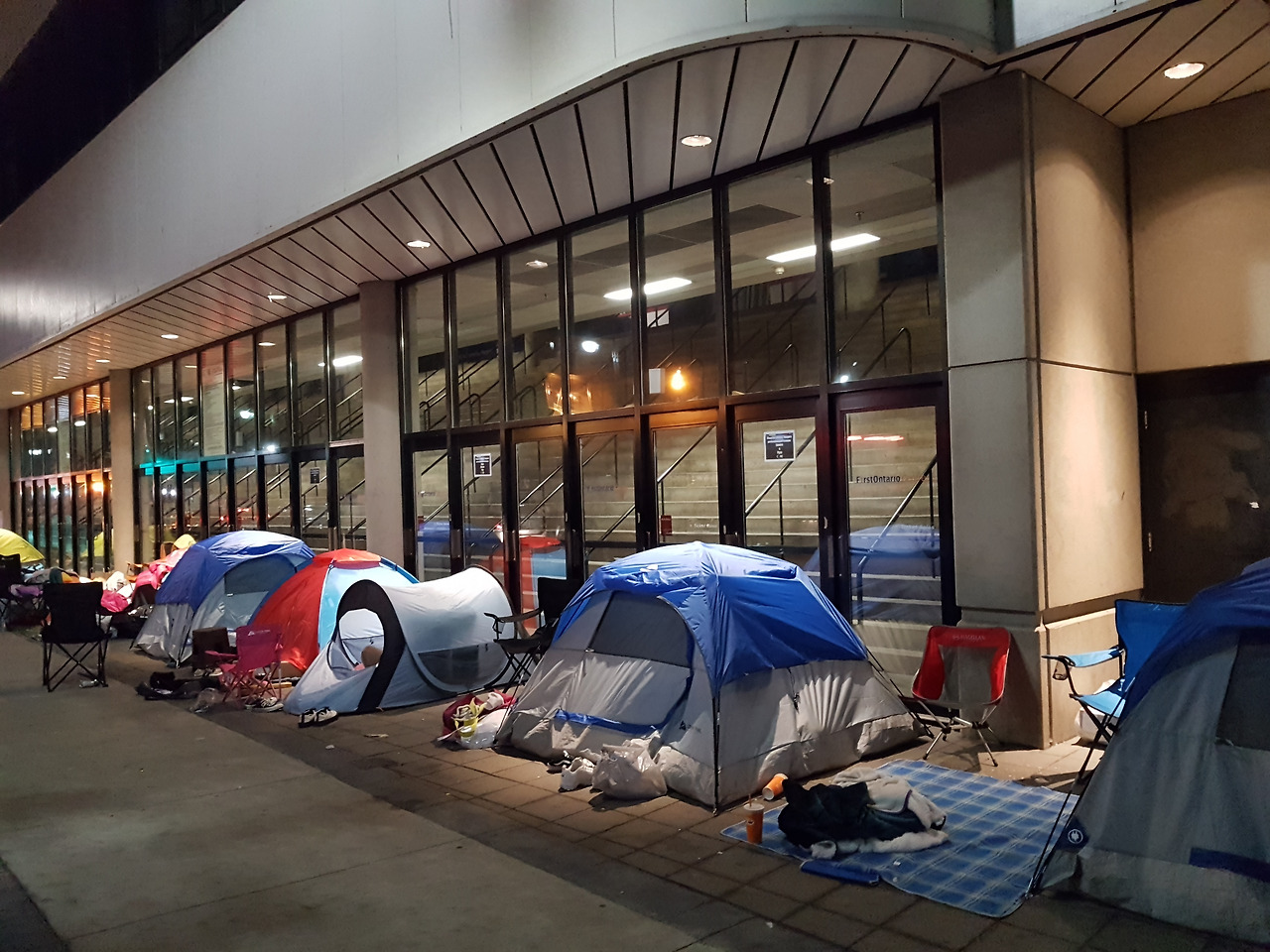 설마 하며 공연장인 First Ontario Centre 앞에 차를 세웠다가 깜짝 놀라고 말았습니다. 이미 캠핑촌을 방불케 할 정도로 끝도 없이 텐트가 늘어져 있었습니다. 이른 새벽이라 대부분의 팬들은 잠을 청하고 있었지만 일부 팬들은 한국어 가사를 따라 부르고, 한국식 응원 방식을 연습하고 있었습니다. 실제 공연장에선 흔히 떼창이라 부르는 한국의 전통적인 공연 문화(?)가 전 세계인에게 펼쳐 나가는 모습을 확인할 수 있었다고 합니다.