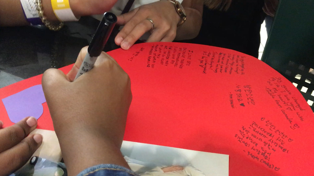 방탄소년단이 가져온 변화와 현상 등에 대한 생각은 다음 편에 이어서 하겠지만, 그전에 마지막으로 한 가지만 언급하고 마무리하겠습니다. 아래 사진은 방탄소년단의 콘서트 현장에서 캐나다의 고등학생들이 방탄소년단에게 글을 쓰고 있는 장면입니다. 이 사진에서는 두 가지를 확인할 수 있는데, 하나는 일행 7 명 중에 한국말을 할 줄 알고 쓸 줄 아는 한국인은 단 한 명뿐이었음에도 불구하고 한글이 여러 군데 등장한다는 사실입니다. 두 번째는 그 한 명의 한국 학생이 적은 글의 내용입니다.