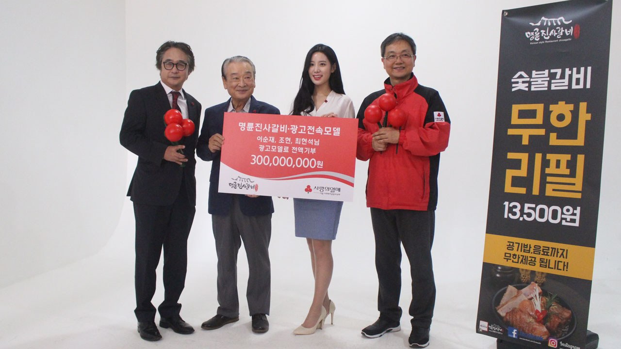 광고가 나오는 동시에 명륜진사갈비 광고에 출연한 이순재, 조현, 최현석은 광고 모델료를 사랑의 열매에 전액 기부했다는 기사가 보도되었다. 또한, 광고 모델료 전액 기부 전후로 명륜진사갈비는 사랑의 열매와 초록우산 어린이재단에 기부금을 기탁했다. 곧이어 코로나 19 사태로 피해를 보는 가맹점들의 월세를 지원하기도 했다. 이러한 행보는 '선한 영향력'을 이용한 마케팅이거나 노블레스 오블리주, 혹은 둘 다일 것이다. 그러나 명륜진사갈비 가맹점과 관련해서 논란도 점차 많아지는 탓에 이미지 세탁을 위한 행보가 아니냐는 빈정거림은 줄어들지 않고 있다.