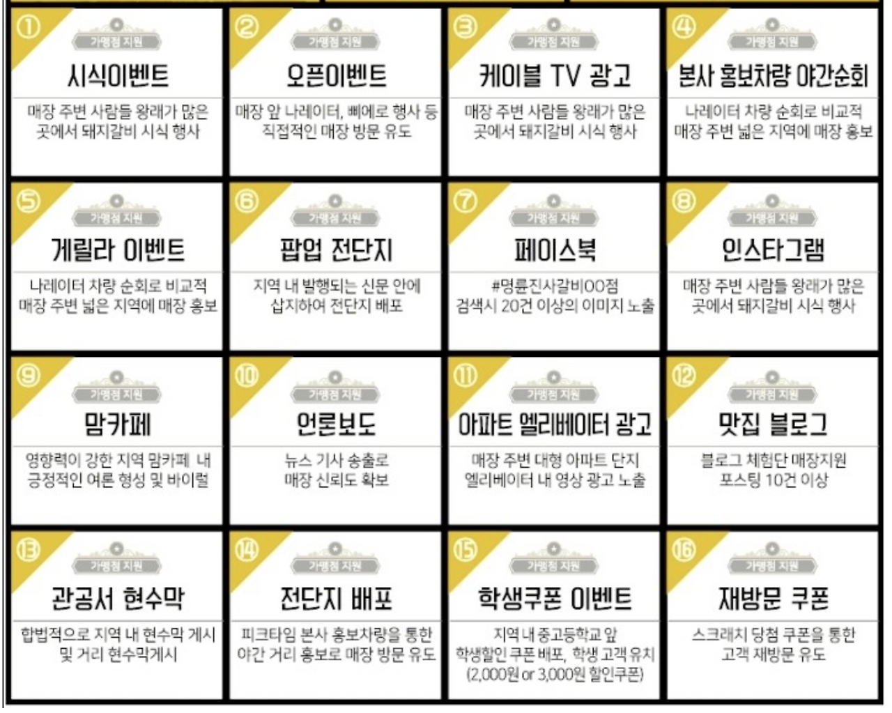 명륜진사갈비의 인지도가 오르는 동시에 가맹점 수도 폭발적으로 증가했다. 2017년 7월에 1호점을 오픈한 명륜진사갈비는 2019년 11월 즈음 무려 500호점을 오픈한다. 이러한 결과는 명륜진사갈비가 예비 창업자들에게 전시하는 모토에서 비롯된다. "마케팅은 본사에 맡기시고, 매장 운영에만 전념하시면 됩니다!"라고 말하며 이른바 '16단계 마케팅 지원'을 진행하고 있었기 때문이다. 초기 창업자가 절대 손쉽게 할 수 없는 온라인 및 오프라인 마케팅을 지원하고 있었다.