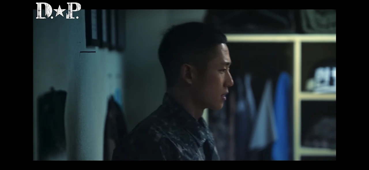 D.P의 1화 오프닝 시퀀스는 조석봉과 안준호를 괴롭히는 황장수의 음성으로 시작한다. 황장수는 석봉을 머리 높이에 못이 박힌 벽 앞에 세워 두고 툭 툭 못을 향해 밀며 겁을 준다. 카메라는 준호에게 집중한다. 정자세로 앞만 보고 앉아있는 준호 뒤로 괴롭힘을 당하는 석봉이 있다. 결국 못에 머리를 박고 머리를 다친 석봉 다음으로 준호가 불린다. 커지는 두려움과 긴장을 함께 느끼며 못 박힌 벽 앞에 서는 준호를 따라 카메라도 이동한다. 그리고 카메라는 화면의 왼쪽에는 벽에 박힌 못을 그리고 오른쪽 끝에는 그 앞에서 선 준호의 옆얼굴을 가득 잡는다. 화면 밖에서 들리는 황장수의 목소리와 손길에 따라 준호의 얼굴이 오른쪽에서 왼쪽으로 툭- 툭- 아슬아슬하게 못까지 밀리다 멈추길 반복한다. 그러다 결국 황장수에 힘에 밀려 준호의 머리가 못에 박히기 직전 화면은 블랙아웃된다. 준호가 다치지 않았는지 멀쩡한지 확인하기 위해서라도 영상을 끌 수가 없다. 그러다 결국 다음화로 넘어가기 버튼을 누른다.