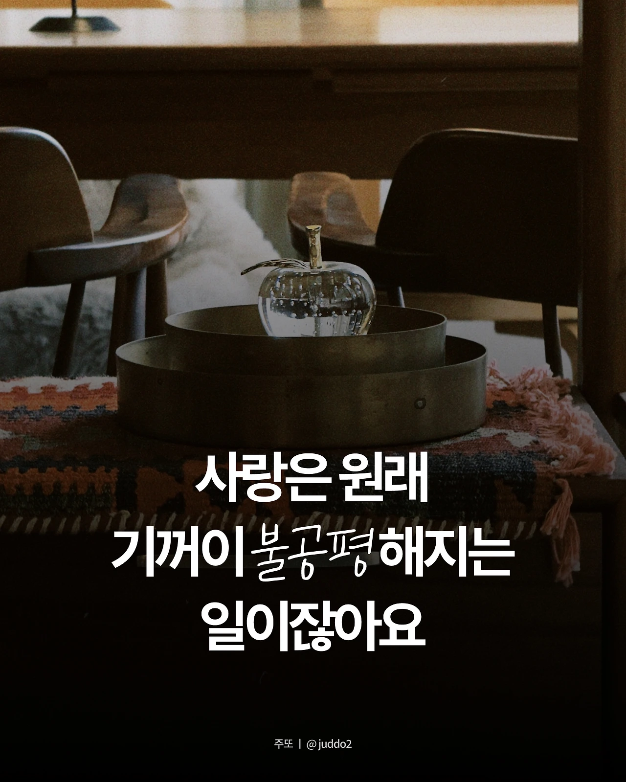 ‘사랑 앞에선 한없이 나약해지는 일’ 사랑 사랑 사랑-할 시, 나는 세상에서 제일 약한 인물이자 강한 사람이 될 수밖에 없었어요. 사랑을 품은 상대에겐 더할 나위 없을 정도로 여린 인간이 되었고요. 그와 동시에, 사랑을 지키기 위해서라면 모든 방면에서 강인해져야만 했어요. 친구들은 노상 나한테 사랑 때문에 왜 그렇게까지 하냐는 질문을 했어요. 하도 들어서 귀에 딱지가 생길 지경이었다만, 막연히 가볍게 웃어넘길 순 없는 물음이었는데요. 정곡이 찔린 날엔 새벽까지 기분이 침침했답니다.