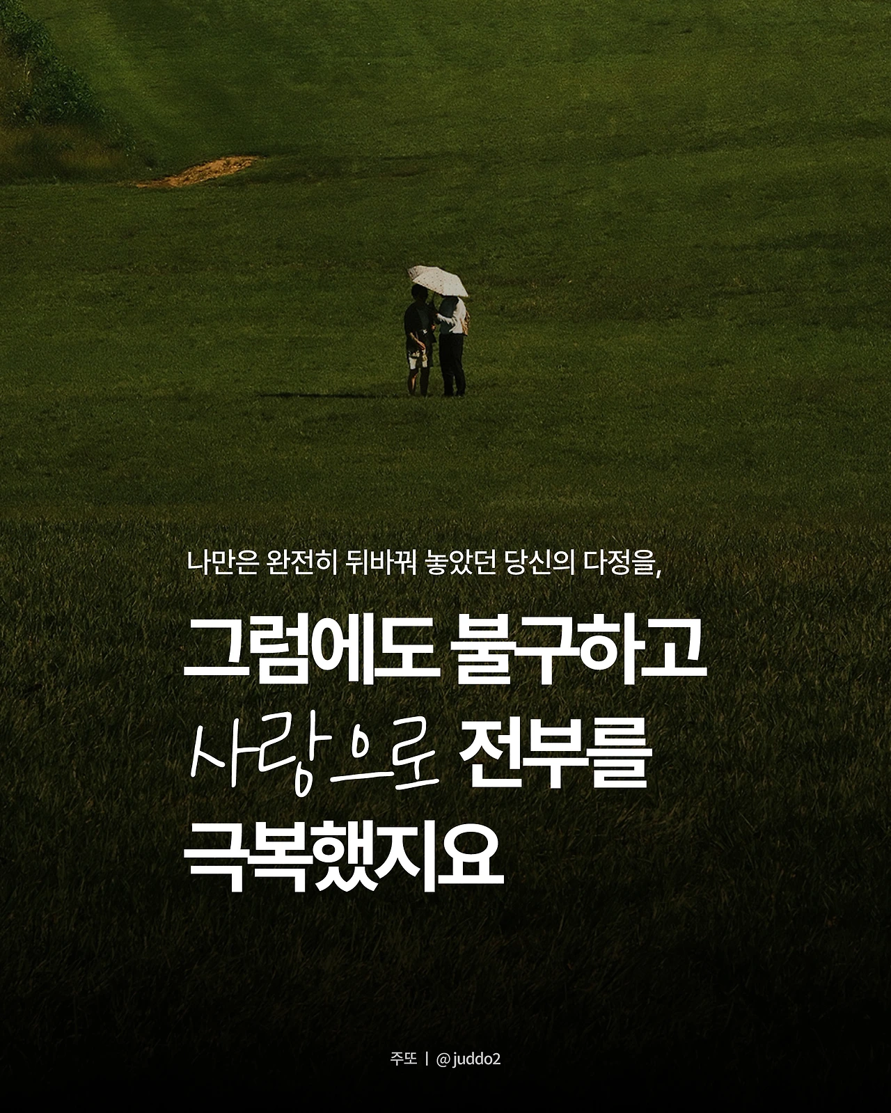 비가 억수로 내리던 날, 체온이 급격히 떨어져감에도 서로를 마주한 채 웃음이 끊이지 않던 순간을 기억합니다. 인생을 바꿀 힘은 전혀 없어도 나만은 완전히 뒤바꿔 놓았던 당신의 다정을, 여전히 애틋해해요.