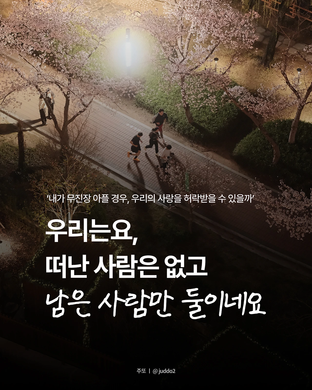 밤이 유난히 기네요. 시시하고요. 어떤 날에는 ‘내가 무진장 아플 경우, 우리의 사랑을 허락받을 수 있을까’ 고민하고요. ‘당신을 제외하곤 지켜야 할 것들이 없었더라면, 우리의 사랑이 수월했을 수도 있는 거 아닌가’ 자책해요. 집안에선 더 이상 실소조차 나오지를 않아요. 외롭고 쓸쓸해요. 헤어짐과 동시에 내 삶을 간신히 밝혀주고 있던 작은 불빛마저 탁, 하고 꺼진 듯 캄캄하고 고독합니다.