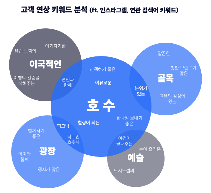 먼저 인스타그램과 인터넷 연관 검색어를 분석했다. 고객이 느끼는 앨리웨이의 이미지가 무엇인지 파악해 보기 위함이었다. 전체적으로 '힐링, 피크닉, 분위기, 이국적인'과 같은 키워드가 도출되었다. 이를 그룹핑해보니 '호수'가 가장 큰 포션을 차지했다. 앨리웨이와 뗄 수 없는 '광교호수공원'이었다.