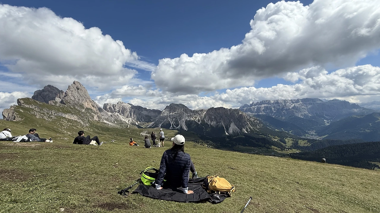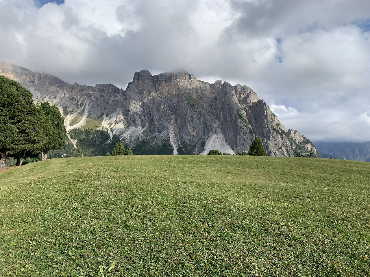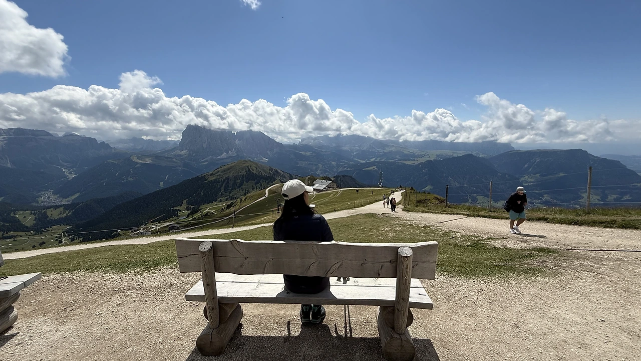 그렇게 신나는 왕복 리프트 놀이를 끝내고 다시 세체다 케이블카 정거장으로 향했다. 케이블카로 세체다에 도착하면 크게 전망대로 가는 왼쪽 길과 사소룽고와 알페디시우시를 파노라마처럼 볼 수 있는 넓은 야생화 평원으로 가는 오른쪽 길이 있다. 우리는 왼쪽, 전망대를 먼저 왔기에, 이번에는 오른쪽 야생화 평원으로 향했다. 8월 말이라 야생화는 거의 없었지만 그래도 산정상의 넓은 평원과 그를 둘러싼 파노라마 뷰는 인상적이었다. 평원에 앉아 풍경을 즐기는 여유를 만끽했다. 우리 앞쪽에 20대 초중반으로 보이는 4명의 중국인 남녀 커플이 꽤 거슬렸다. 게다가 그중 한 남자는 중국어로 노래까지 불러댔다. 그러나 그 어떤 장애물도 형언 불가의 아름다움과 평화로움을 해칠 수는 없었다.