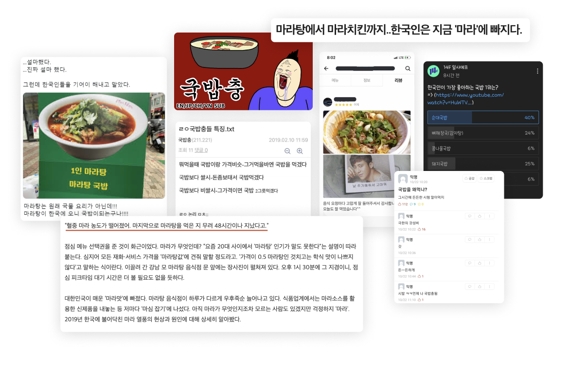 유저가 앱을 사용할 때 보통은 긍정적인 경험을 유도하는게 우리의 몫이다. 그래서 부정적인 주제보단 긍정적인 중독에 대해 생각해보기로 했다. 그러다 '마라탕 중독'이라는 키워드가 나왔다. 한참 마라탕, 국밥 중독이 밈처럼 쓰였던 때였다. 다들 재밌다는 반응이었고, '혈중마라농도 떨어진다'는 밈에서 착안한 마라탕&국밥 중독자를 위한 앱 서비스를 기획하게 되었다.