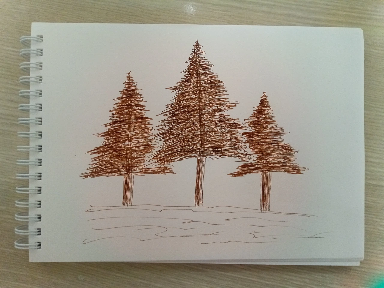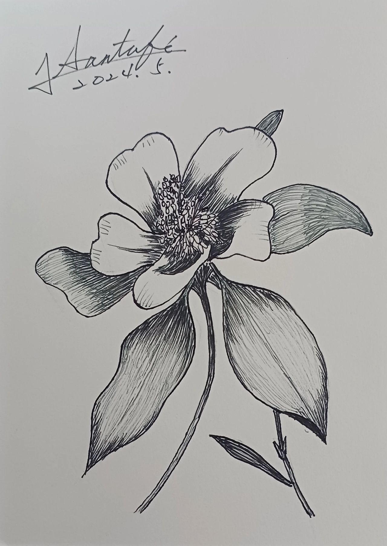 내가 선택한 그림은 나무. 다양한 나무가 있지만 유튜브 쥔장이 하두 쉽다고 하기에 속는 셈 치고 선택했다. 우선 형태를 잡기 위해 연필로 테두리 만들어주기. 그런데 처음부터 쉽지 않다. 테두리를 그려서 그럴듯한 형태를 만들어야 하는데 자꾸 이상한 모양새가 나온다. 분명 잎사귀 부분을 뭉뚱그려서 삼각형을 그리고 줄기 부분은 조금 삐뚤삐뚤한 모습으로 만들라고 했는데 도화지에 그려진 모습은 자꾸만 네모난 작은 상자 위에 정삼각형이 올라있는 모양새다. 쬐그마한 핸드폰의 그림을 보면서 지웠다가 다시 테두리를 잡기를 몇 번이고 반복을 하다가 겨우 이 정도면 되지 않았냐며 극적 합의를 이루어냈다. 두 번째 단계로 나무 꼭대기에서 시작하여 아래로 내려오며 가지와 잎사귀 부분을 표현하는데 중요한 포인트는 선을 길게 긋지 말고 처음부터 끝까지 한 번에 그린다는 각오로 손을 부들부들 떨면서 지랄발광을 하란다. 절대 삼각형을 벗어나지 않아야 한다는 안내와 함께 내 손은 거침없이 부들부들 떨기 시작했다. 어? 근데 이게 왜 되는 거지? 설명해 준 그대로 따라 했을 뿐인데 제법 있어 보이는 그림이 되었다. 내친김에 이번엔 꽃 그림이다. 또 되네? 거참, 신기한 일일세. 혹시 나 금손?