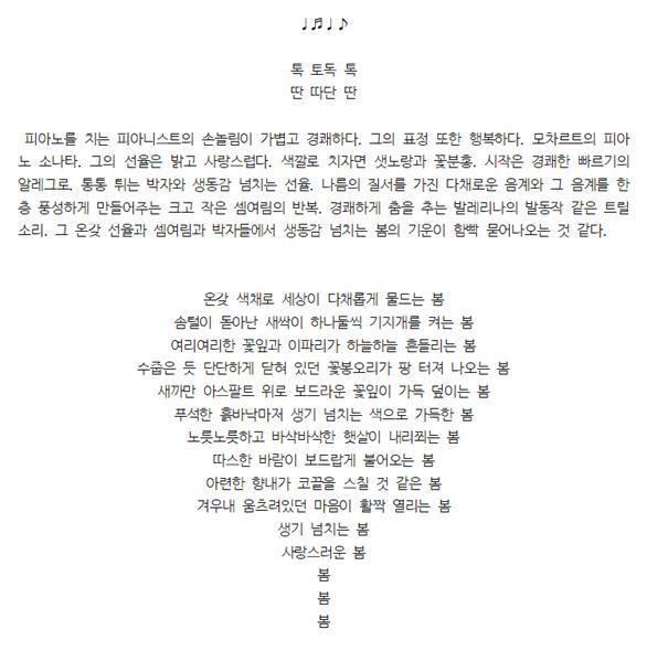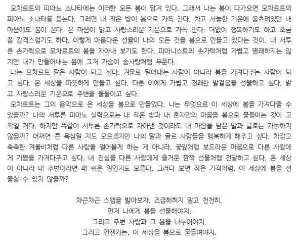 모차르트는 그의 음악으로 온 세상을 봄으로 만들었다. 나는 무엇으로 이 세상에 봄을 가져다줄 수 있을까? 나의 서투른 피아노 실력으로는 내 작은 방과 내 혼자만의 마음을 봄으로 물들이는 것이 고작일 거다. 하지만 똑같이 서투른 손가락으로 자아낸 것이라도 내 마음을 담은 말과 글로는 가능하지 않을까? 어쩌면 큰 욕심일 지도 모르겠지만 나의 말과 글로 사람들을 행복하게 해주고 싶다. 차갑고 축축한 겨울비처럼 다른 사람을 얼어붙게 하는 게 아니라, 꽃잎처럼 보드라운 마음으로 다른 사람에게 기쁨을 가져다주고 싶다. 내 진심을 다른 사람에게 즐거운 깜짝 선물처럼 전달하고 싶다. 온 세상이 아니라 내 주변이라면 꽤 쉬운 일인지도 모른다. 그러다 보면 작은 기적처럼, 이 세상에 봄을 선물할 수 있지 않을까?
