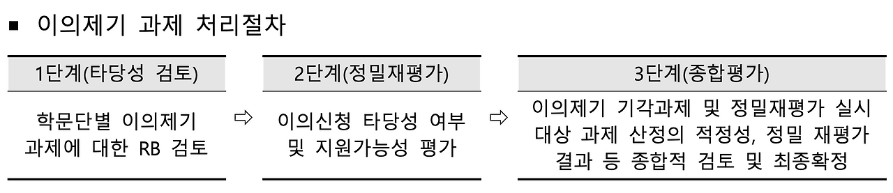 탈락한 과제의 이의신청은 매우 제한된 범위에서, 10일 정도의 기간을 주고 접수하고 있는데, 보통 기관에서 안내하는 내용은 다음과 같다.