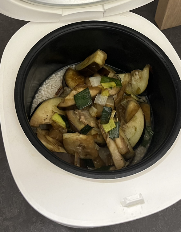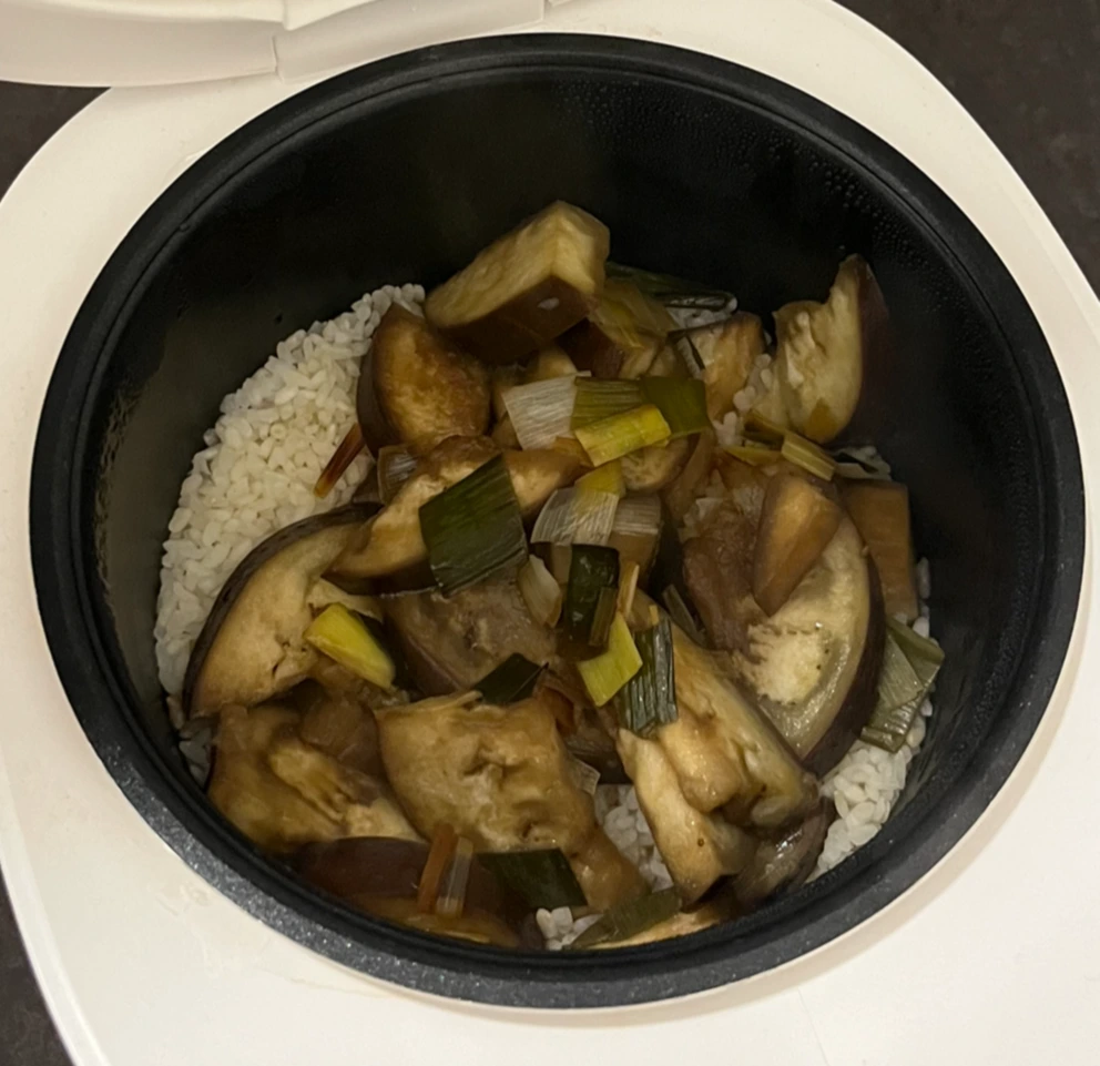 이제 불려둔 쌀 위에 볶은 가지를 올리면 끝이다.