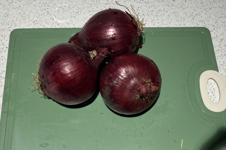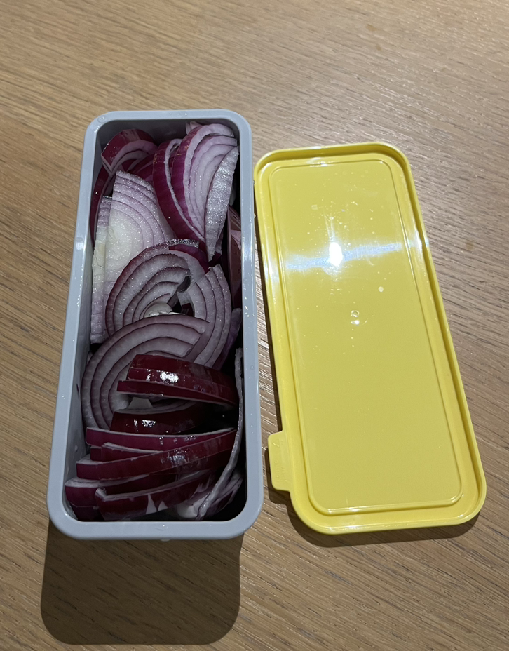 취사 버튼을 눌러 놓고 사 온 양파를 썰어줬다. 적양파는 일반 양파보다 덜 맵고 단맛이 조금 더 강하다고 한다. 채 썬 적양파를 물에 담가 매운맛을 빼주고 통에 담아두면 끼니마다 꺼내 먹기 좋다.