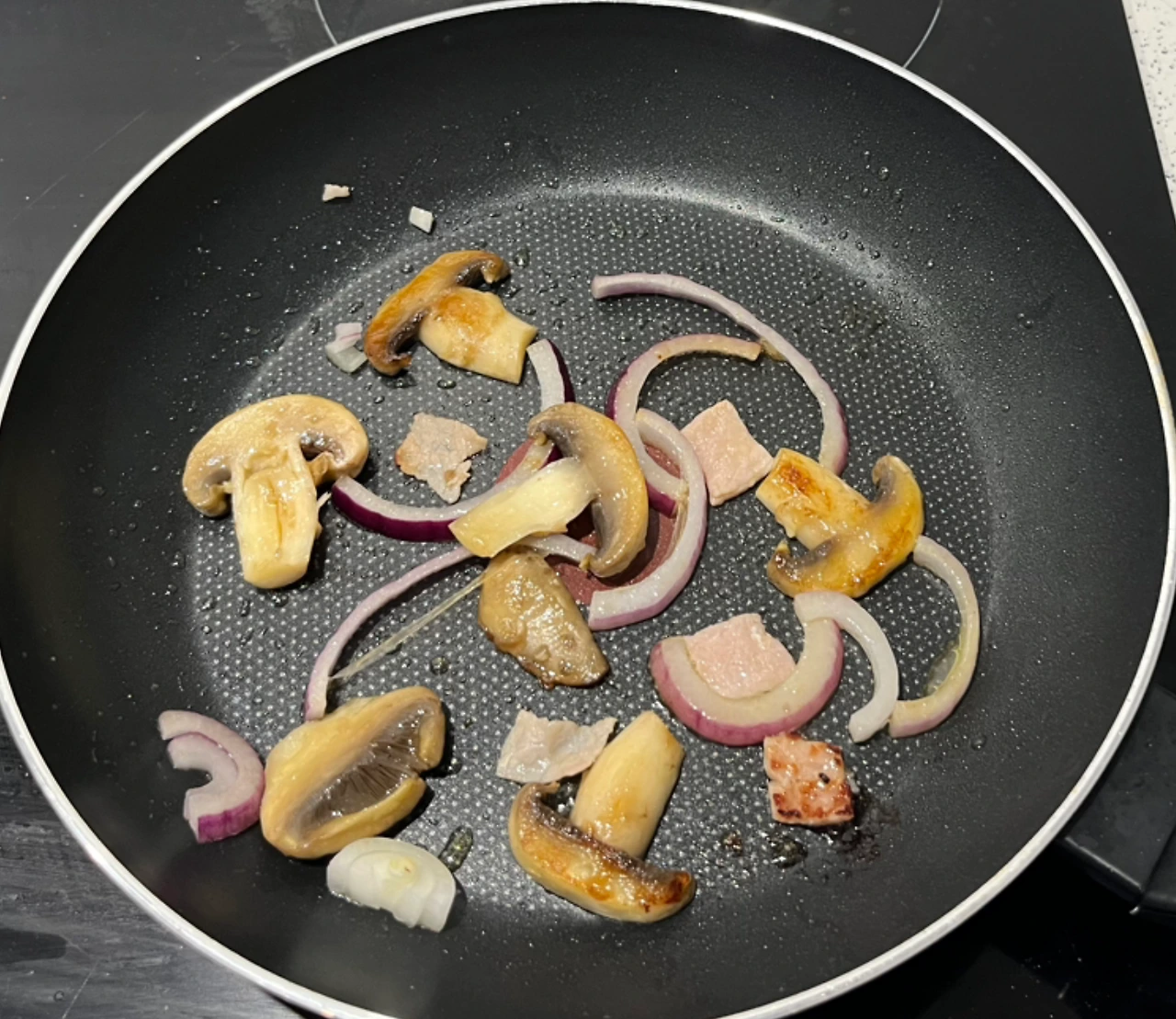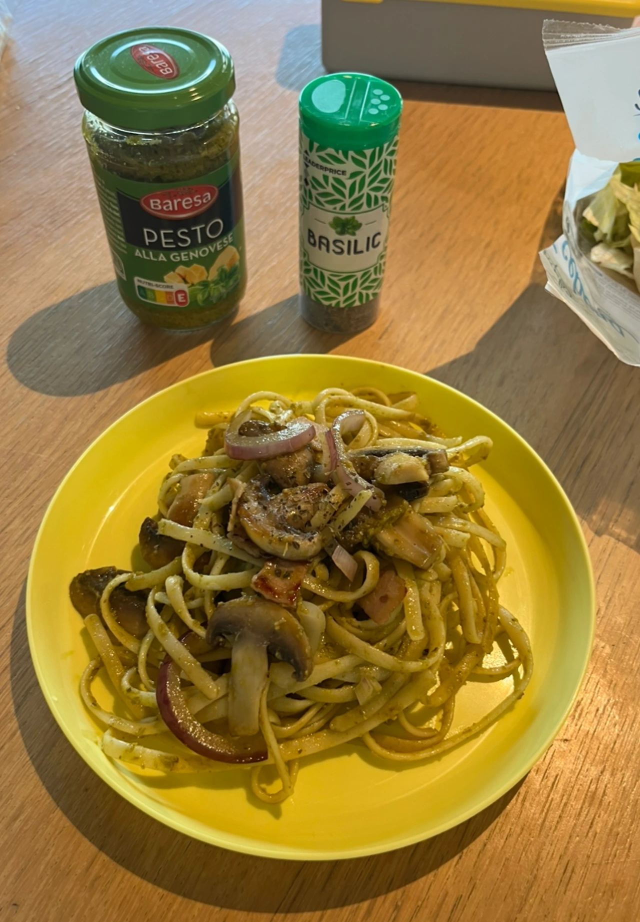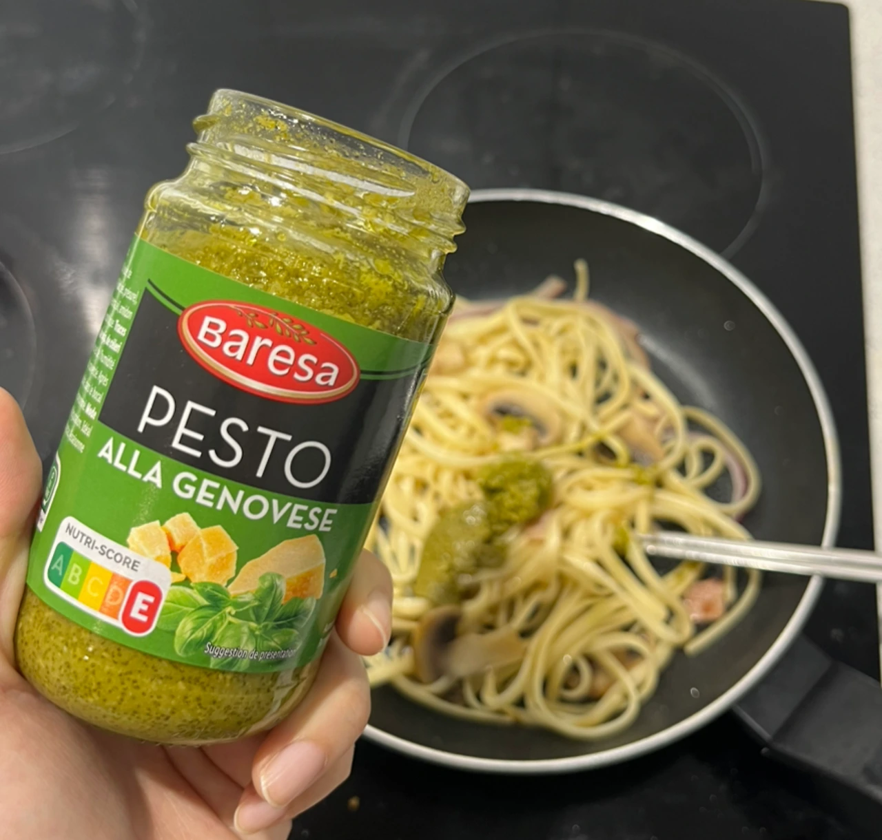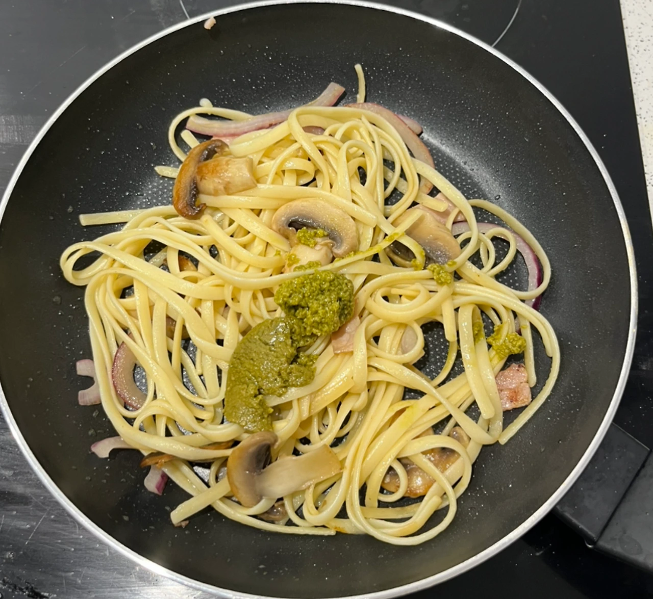 올리브 오일을 4스푼 정도 두르고 양송이, 양파, 베이컨을 볶아준다. 재료가 익으면 삶은 면을 넣는다. 면을 넣고 볶다가 불을 끄고 바질페스토를 넣어 비빈다. 바질은 열에 약해서 불을 끄고 바질페스토를 넣는 게 좋다고 한다.