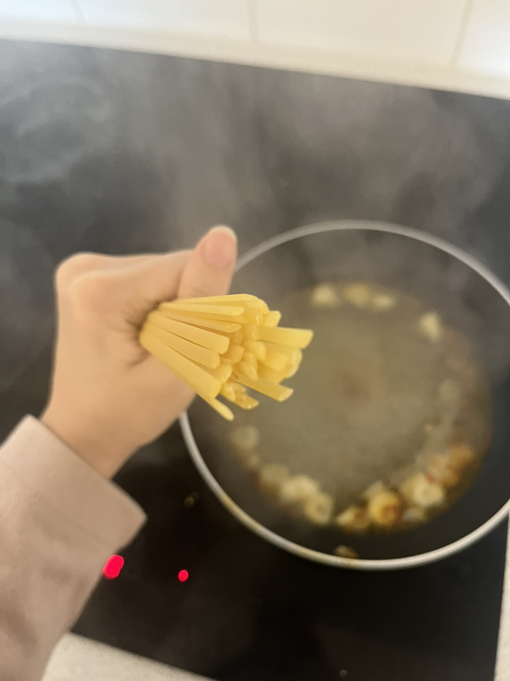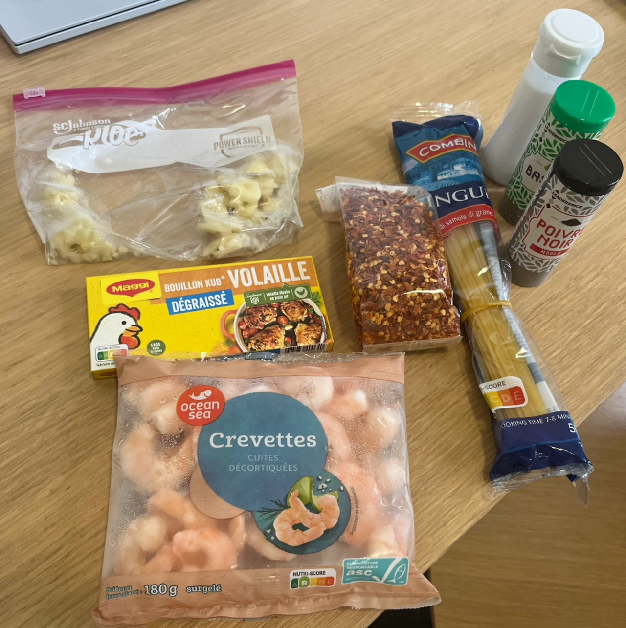 재료: 마늘, 새우, 링귀니면, 페퍼론치노, 소금, 후추, 바질, 치킨스톡, 올리브 오일