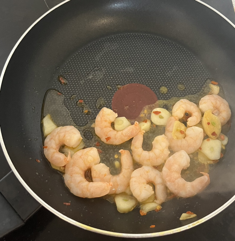 마늘이 어느 정도 노릇하게 익으면 페퍼론치노와 새우를 넣는다.