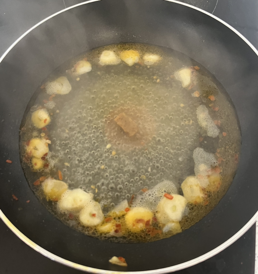 이제 물을 넣고 끓여 준다. 치킨스톡 블록 반 개랑 소금도 한 꼬집도 넣었다.