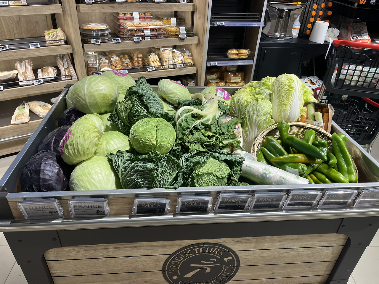 다양한 배추를 팔고 있었다. 여기서 양배추 한 통을 담았다. 양배추는 3.4유로였다. 하나 사서 채 썰면 정말 많은 양이 나오기 때문에 이 정도 가격이면 싸다고 생각한다.