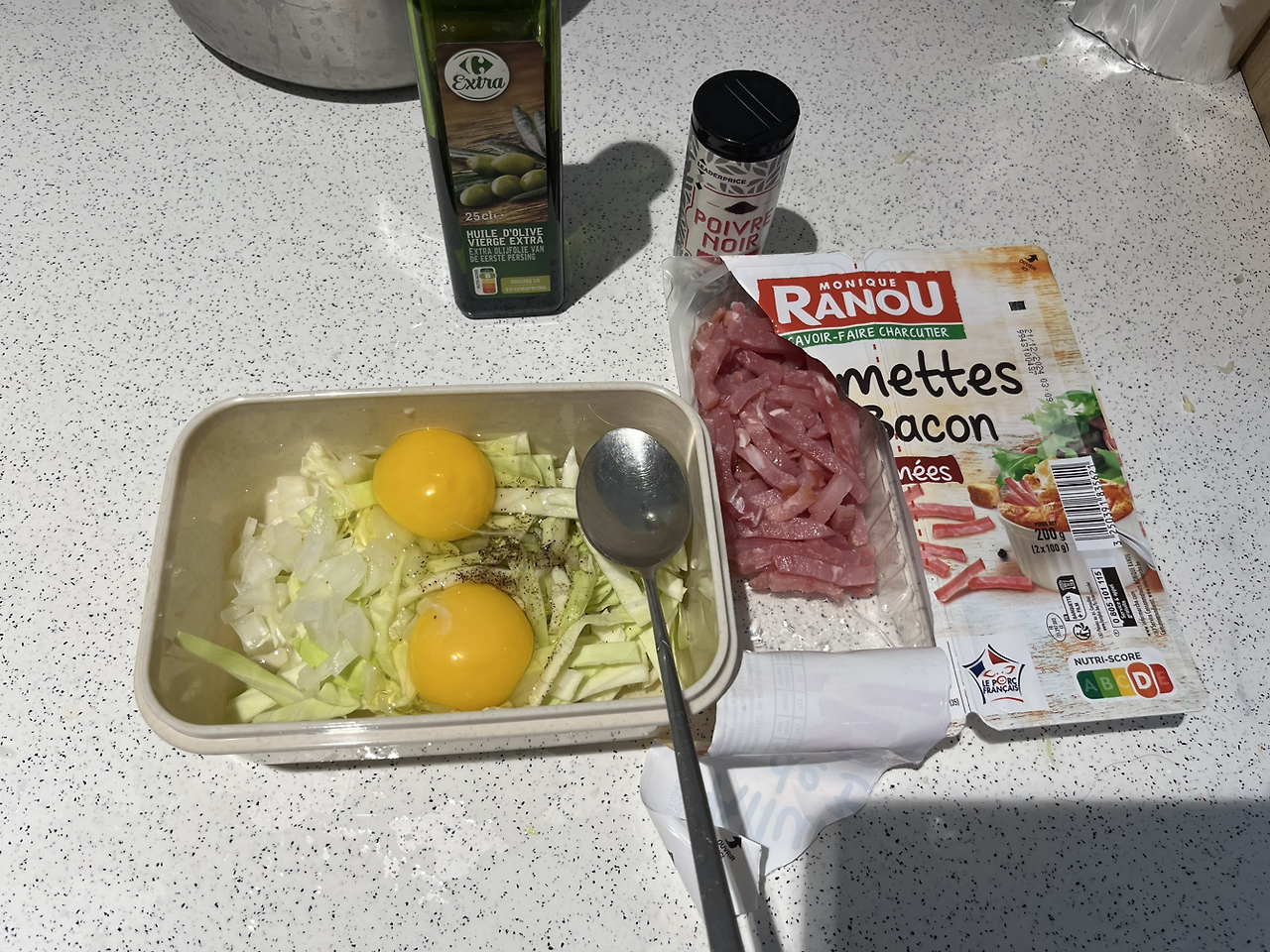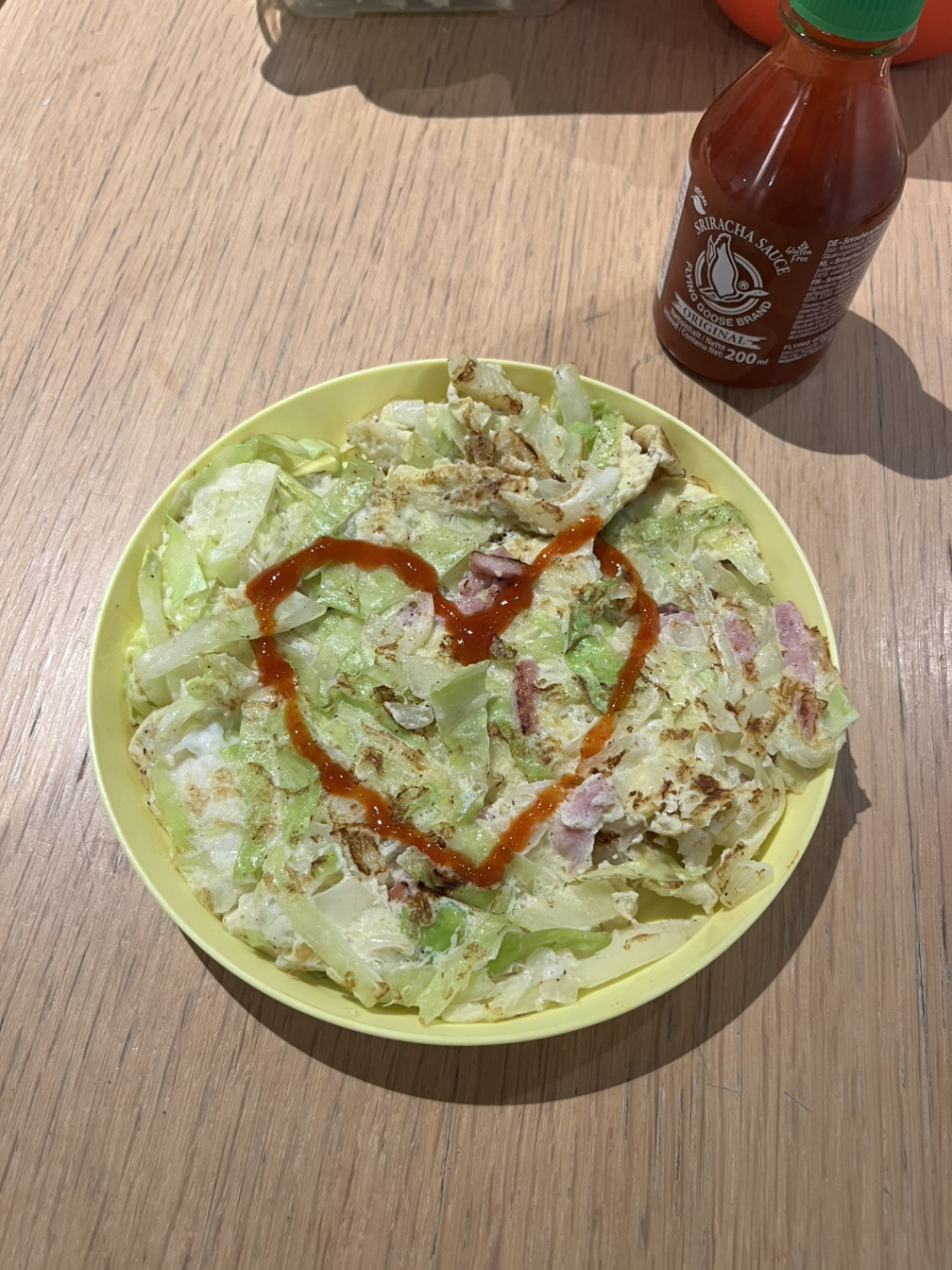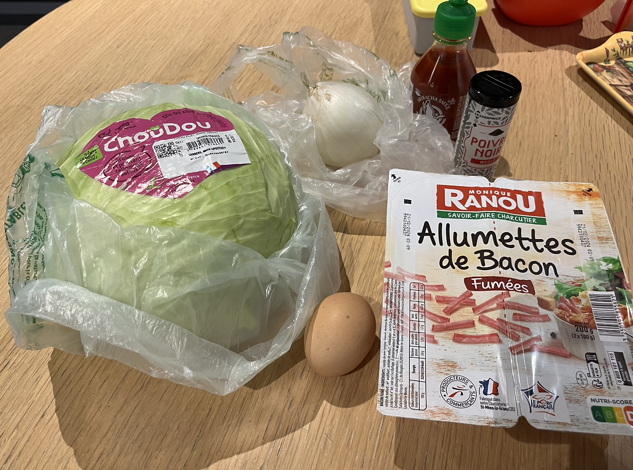 재료: 양배추, 계란 2개, 양파, 베이컨, 후추, 스리라차소스, 올리브오일