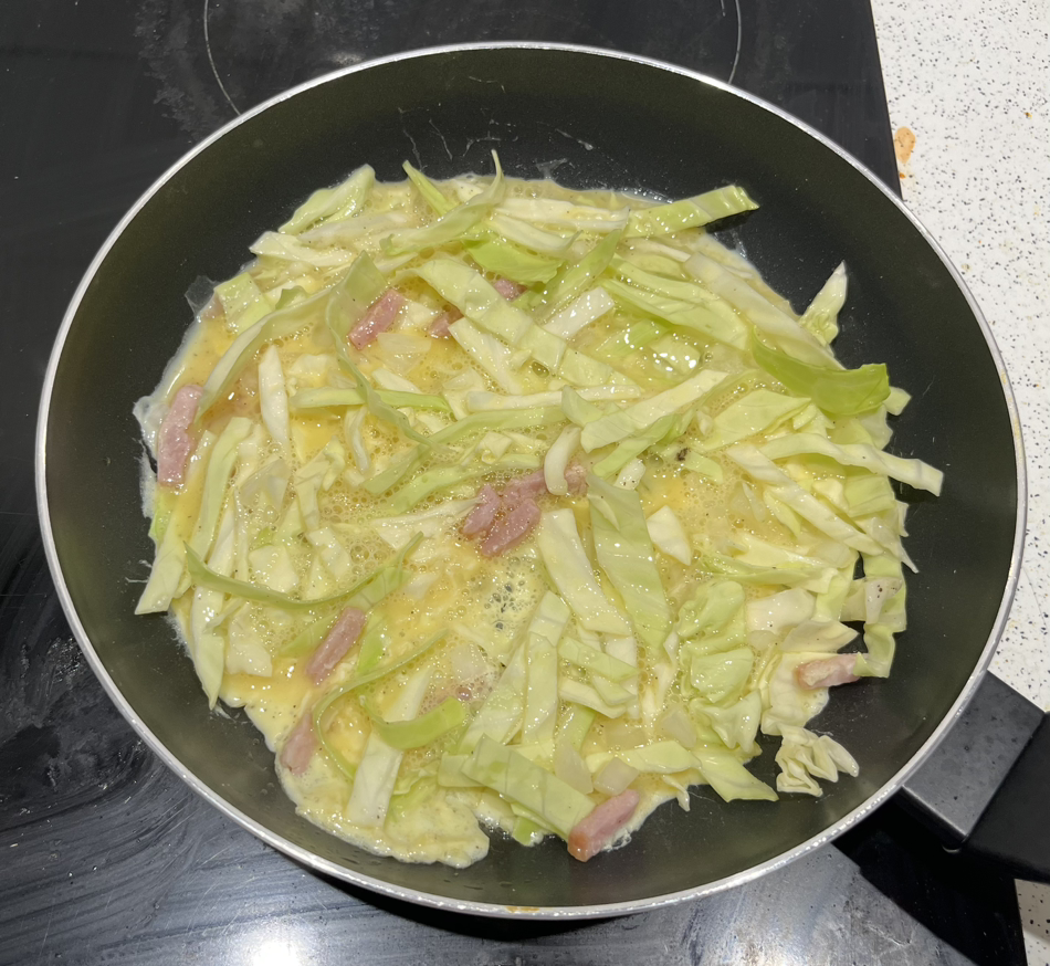 팬에 만들어 놨던 양배추 계란물을 붓는다. 양배추가 골고루 퍼지게 펼쳐준다.