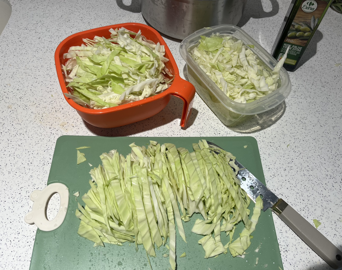 양배추 반 통을 채 썰었다. 양배추 전에 들어가는 양배추는 얇게 썰 수록 좋은데 칼이 작다 보니 그냥 큼지막하게 썰었다. 크게 썰으니까 양배추가 잘 느껴져서 나름대로 맛있고 좋았다.