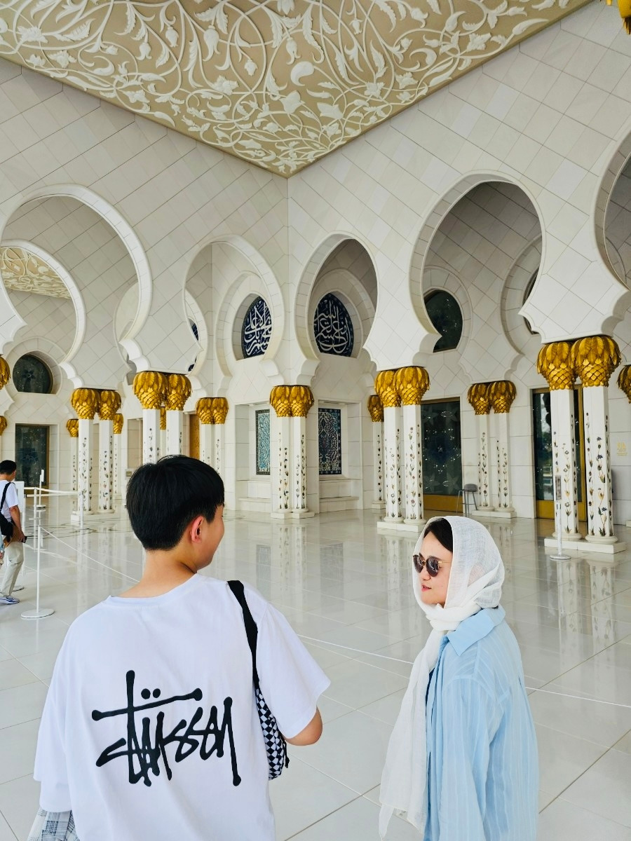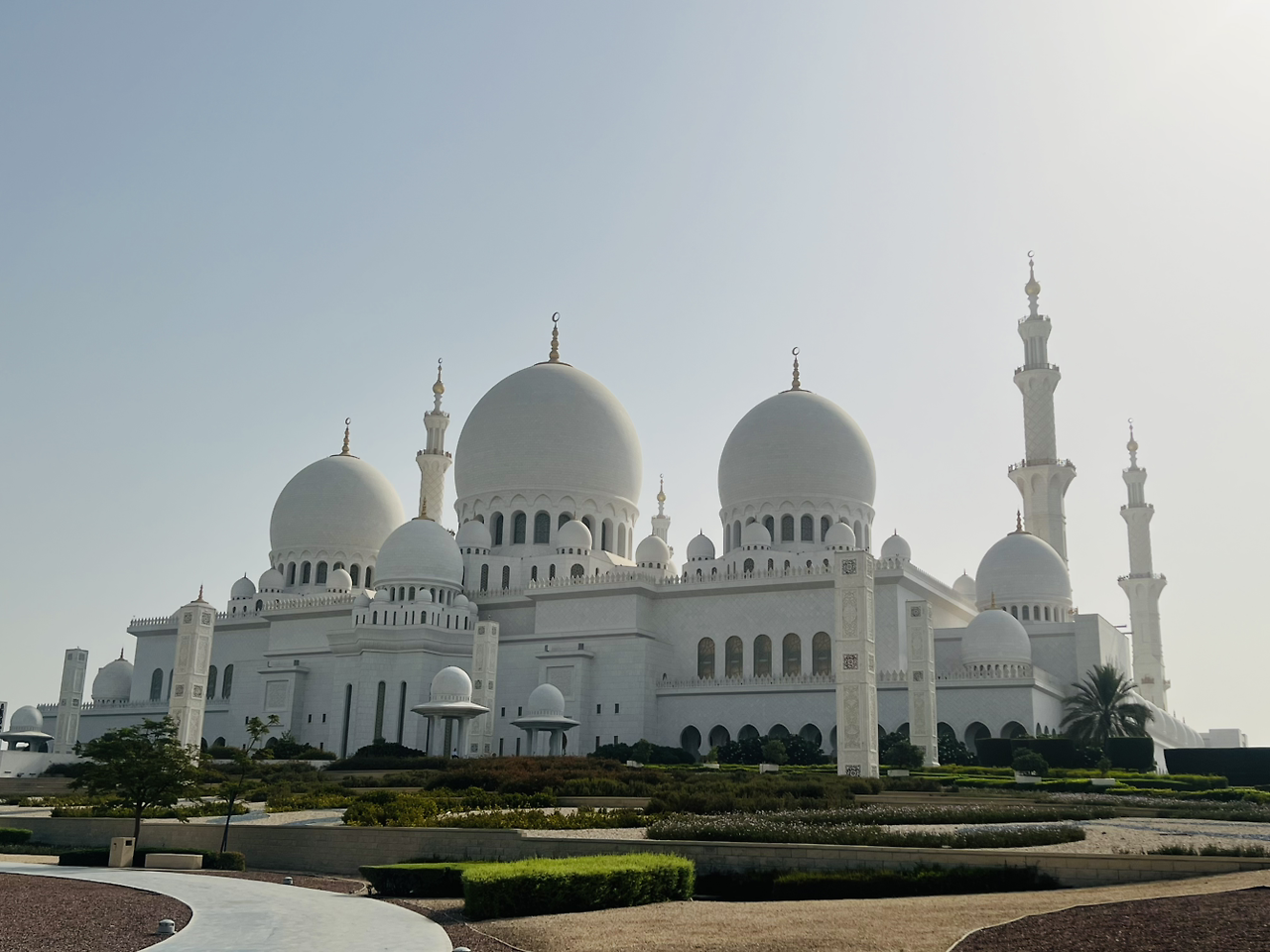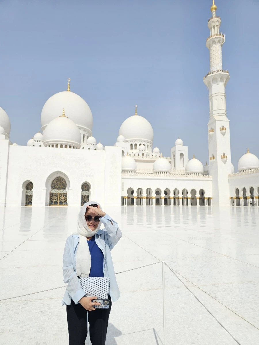 렌터카를 타고 찾은 첫 도착지는 아부다비를 대표하는 셰이크 자이드 그랜드 모스크(Sheikh Zayed Grand Mosque) 사원이었다. 순백의 대리석 건물이 햇살을 받아 반짝이고, 82개의 돔과 높은 첨탑이 웅장하게 서 있었다.