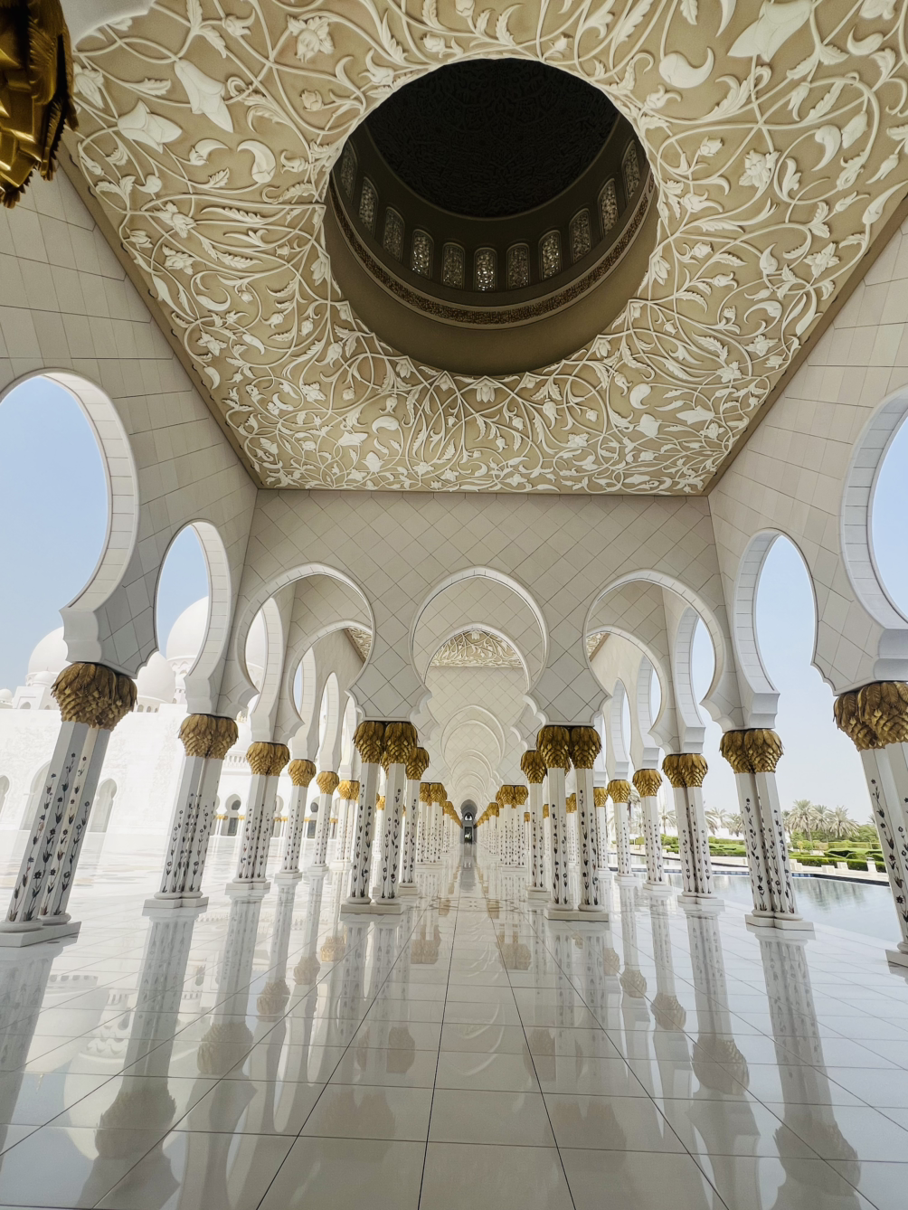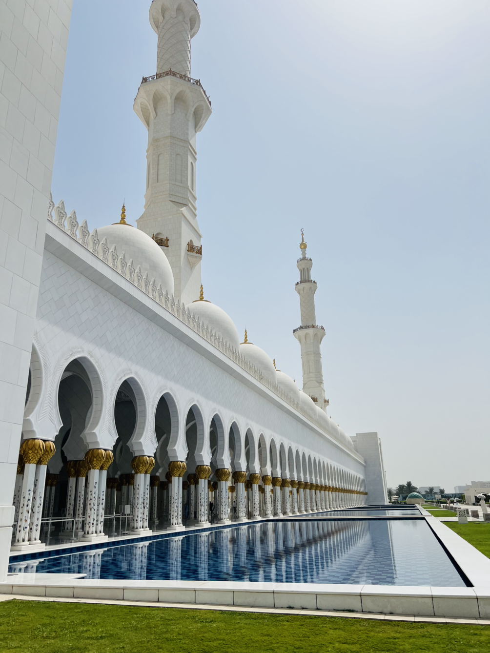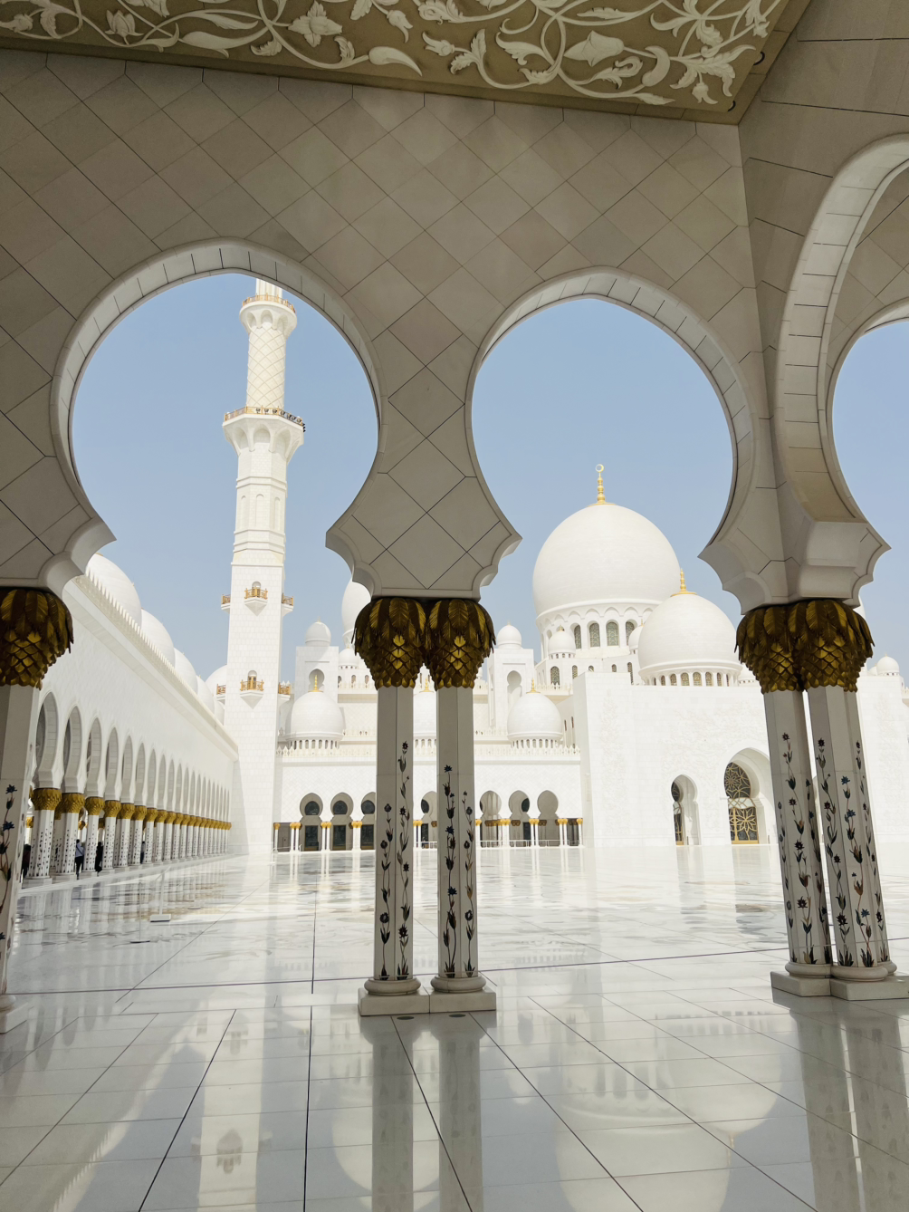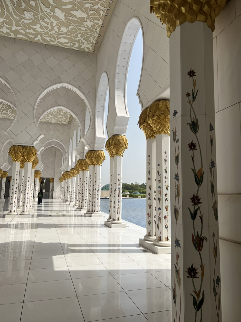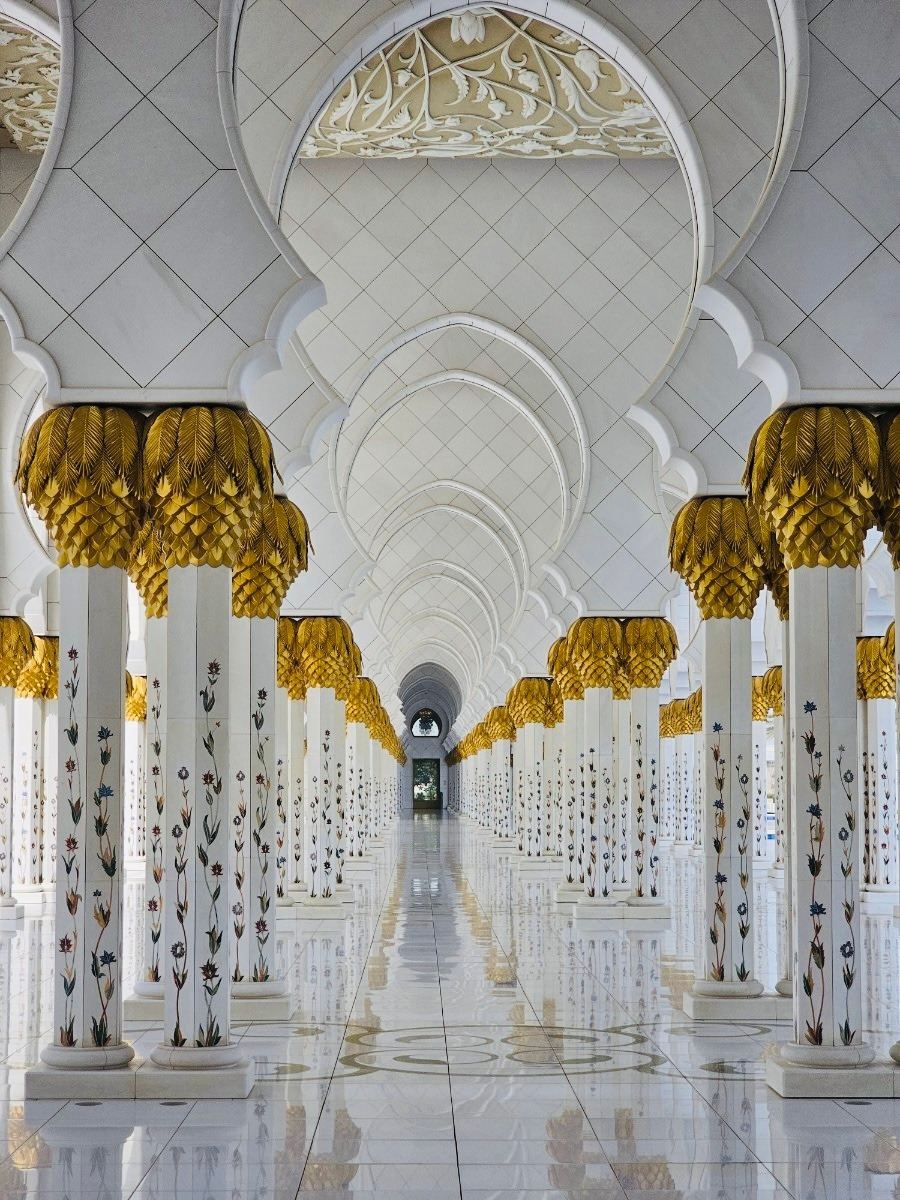 낮에는 밝고 눈부신 빛으로, 건물전체가 하얗게 빛났다. 사원의 회랑을 따라 걷다 보면 끝없이 이어지는 아치 복도가 가장 먼저 눈에 들어온다. 흰 대리석 기둥 위로 부드럽게 이어진 곡선들이 줄지어 서 있는데 너무 우아했다.