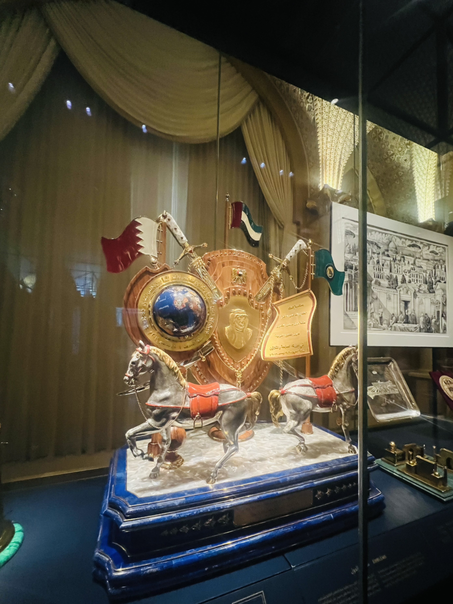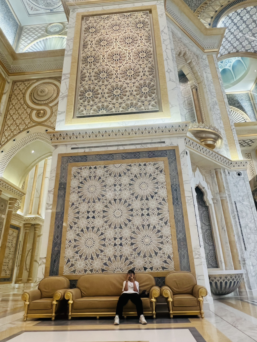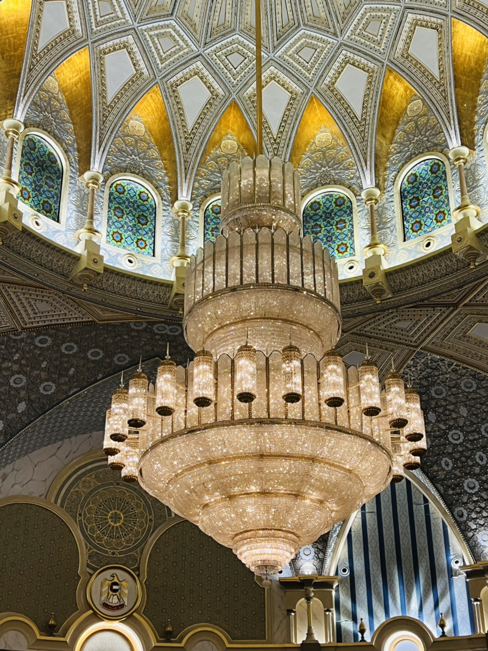 모스크가 순백의 평화로 마음을 차분하게 만들었다면, 알 와탄 왕궁은 그보다 훨씬 화려했다. 끝없이 이어지는 금빛 샹들리에와 정교한 장식들이 시선을 사로잡았고, 궁전 자체가 하나의 예술 작품처럼 빛나고 있었다.