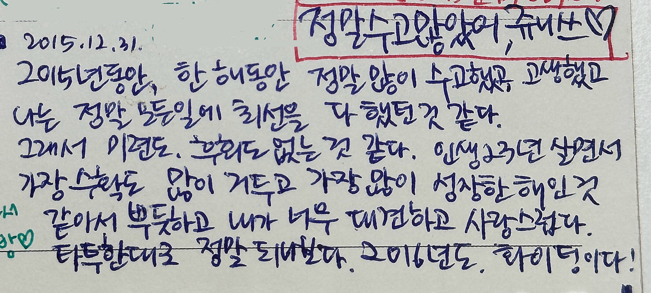 이대로 아무것도 남기지 않은 채 죽을 뻔했다는 사실에 아찔했다. 물론 각종 사진과 서류들로 '나의 살아있음'을 증명할 수 있었지만, 내가 남긴 나만의 기록이 없다는 것이 매우 아쉬웠다. 이 땅에 발 붙이고 살았었다는 나만의 흔적. 그 흔적을 남겨야겠다는 생각이 들었다. 그렇게 2014년 10월 1일 이후, 나는 [일기]를 쓰기 시작했다.