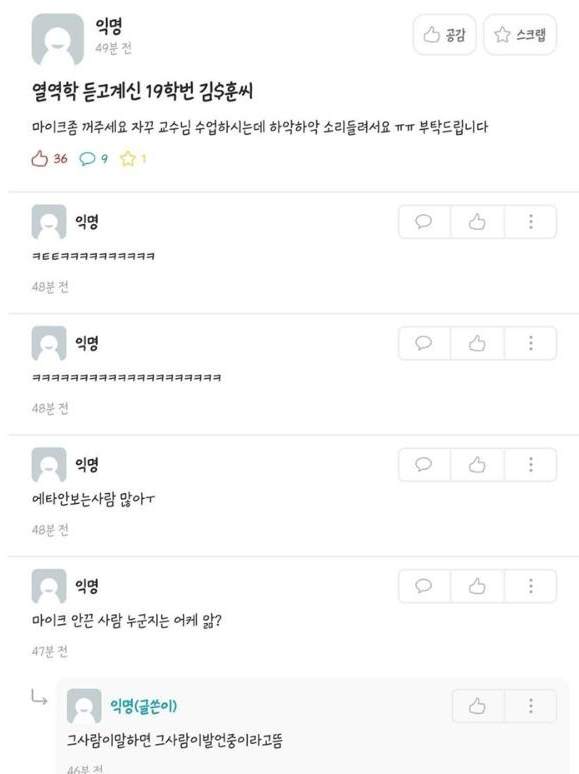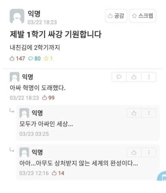 공부가 잘 안된다는 의견 역시 지배적이다. 인터넷이 공부에 가장 큰 방해꾼인데 인터넷으로 강의하는 것에 집중할 리가 없다. 여러 레전드 빌런도 등장 중이시다. 마이크를 켜고 라면 먹는 빌런, 기침 빌런, 달그락달그락 숟가락 소리를 내는 국밥 빌런까지(실화다...). 제일 안 좋은 것은 과제. 교수님들이 학생의 수업 참여도를 확인할 수 있는 방법은 사실상 과제밖에 없다. 그래서 오히려 과제만 늘어난 느낌이라고 한다.