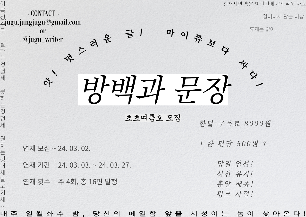 *문의사항 의문사항 불편사항 무조건적인 응원은 인스타그램 @jugu_writer DM 혹은 jugu.jungjugu@gmail.com으로 연락 주세요.