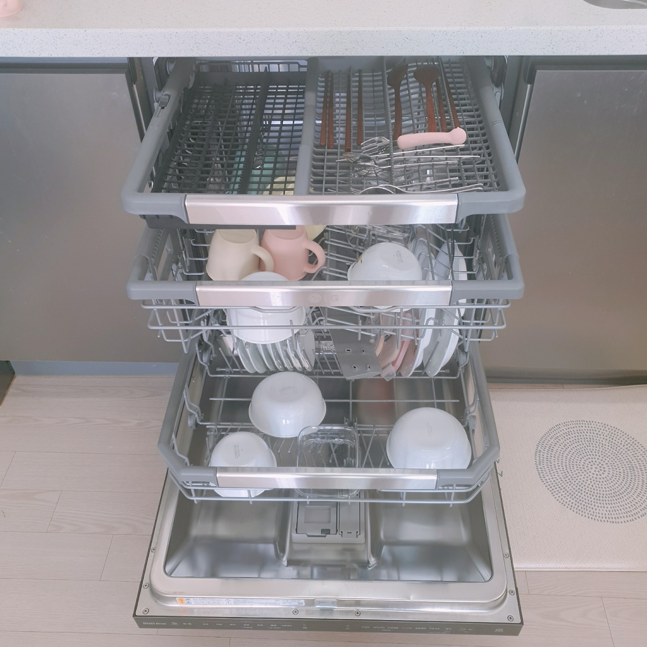 다 돌아가면 이렇게 모두 열어두고 잔다. 자고 일어나면 자연건조돼있어 그릇들을 제자리에 돌려두면 그만이다. 자동 건조 기능은 전기세를 줄이기 위해 사용하지 않고 있다.