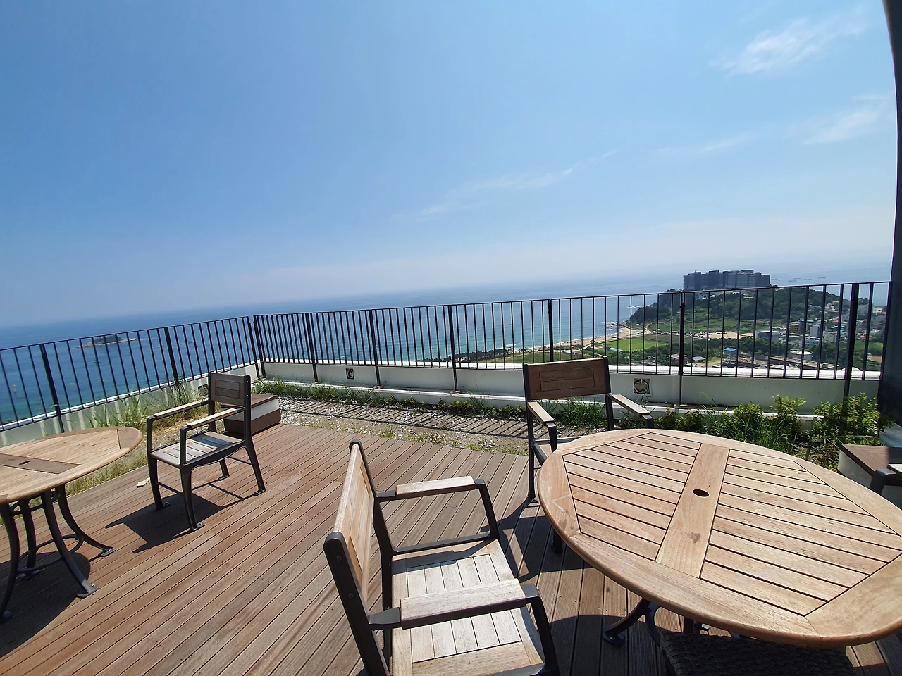 바다가 정면으로 내다보이는 테라스로 나가보았다. 뻥뚤린 사방으로 바다가 가득 채우고 있었다. 그늘 한점 없고 불어오는 바람마저 열기로 데워져 있었다. 다시 실내로 들어와 바다가 보이는 테이블에 자리를 잡았다.