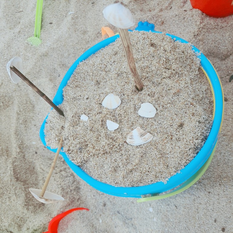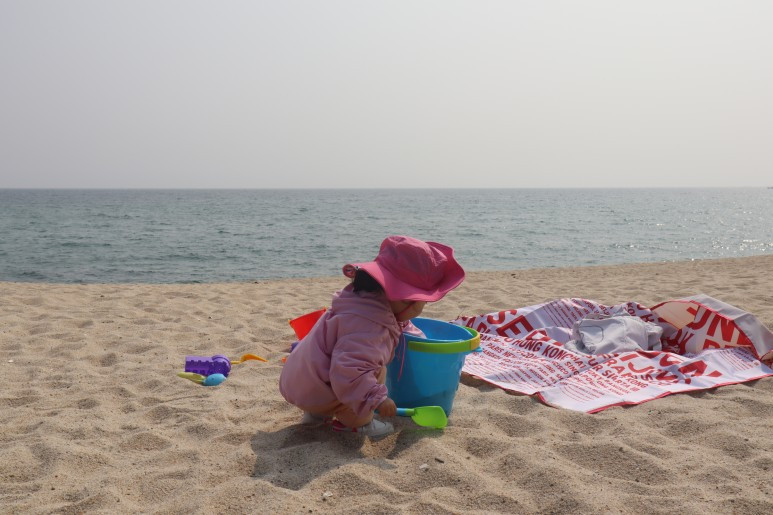 이 날도 아이는 사이트 주변의 솔밭에서 다양한 크기의 솔방울들을 보물처럼 모았고, 모래와 조개껍데기로 자신만의 세계를 표현했다.