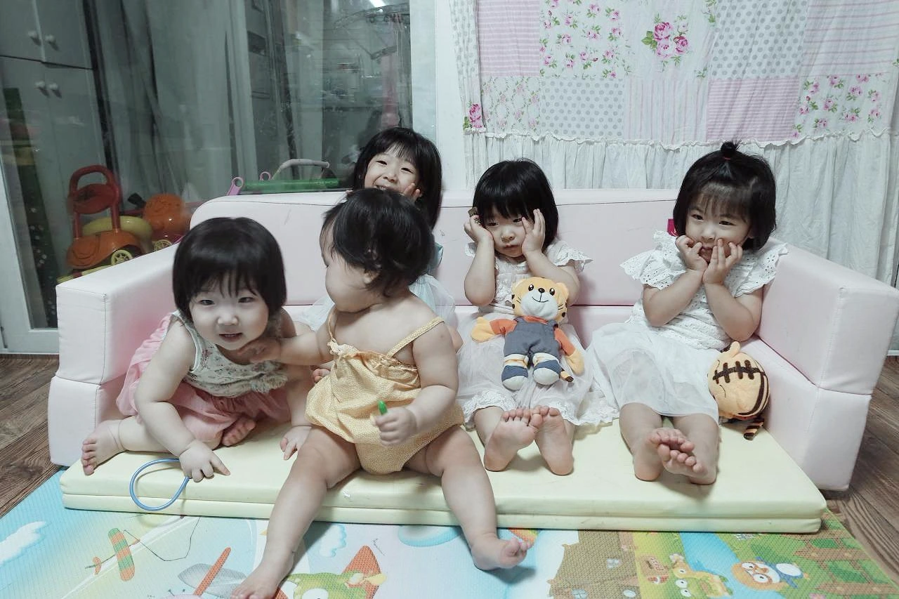 이 가족은 아빠, 엄마, 하윤(6), 윤(3), 현(3), 예원(2) 이렇게 여섯 식구다. 이 부부는 아이를 오래 기다렸다. 그래서 찾은 병원에서 생각지 않은 청천벽력 같은 소식을 들었다. 불임의 확률이 높다는 것이다. 의사의 진단은 부부를 실의에 빠지게 했다. 불임의 가능성을 진단했지만 이미 마음에는 불임이 선고된 것 같았다. 감사하게도 부부는 이를 잘 이겨내고 시험관 아기에 성공했다. 그래서 태어난 아이가 첫째 '하윤'이다. 그리고 감사하게도 둘째도 성공했다. 쌍둥이였다. 이 둘은 이란성쌍둥이로 '윤'이와 '현'이다. 그리고 자연임신에 성공한 막내는 시아보다 5개월 먼저 태어난 시아 친구 '예원'이다. 진단은 진단일 뿐이었다. 결국 부부는 다복한 가정을 이루었다. 이렇게 모이니 합이 아홉이다. 겨우 두 가정이 모였을 뿐인데 말이다.