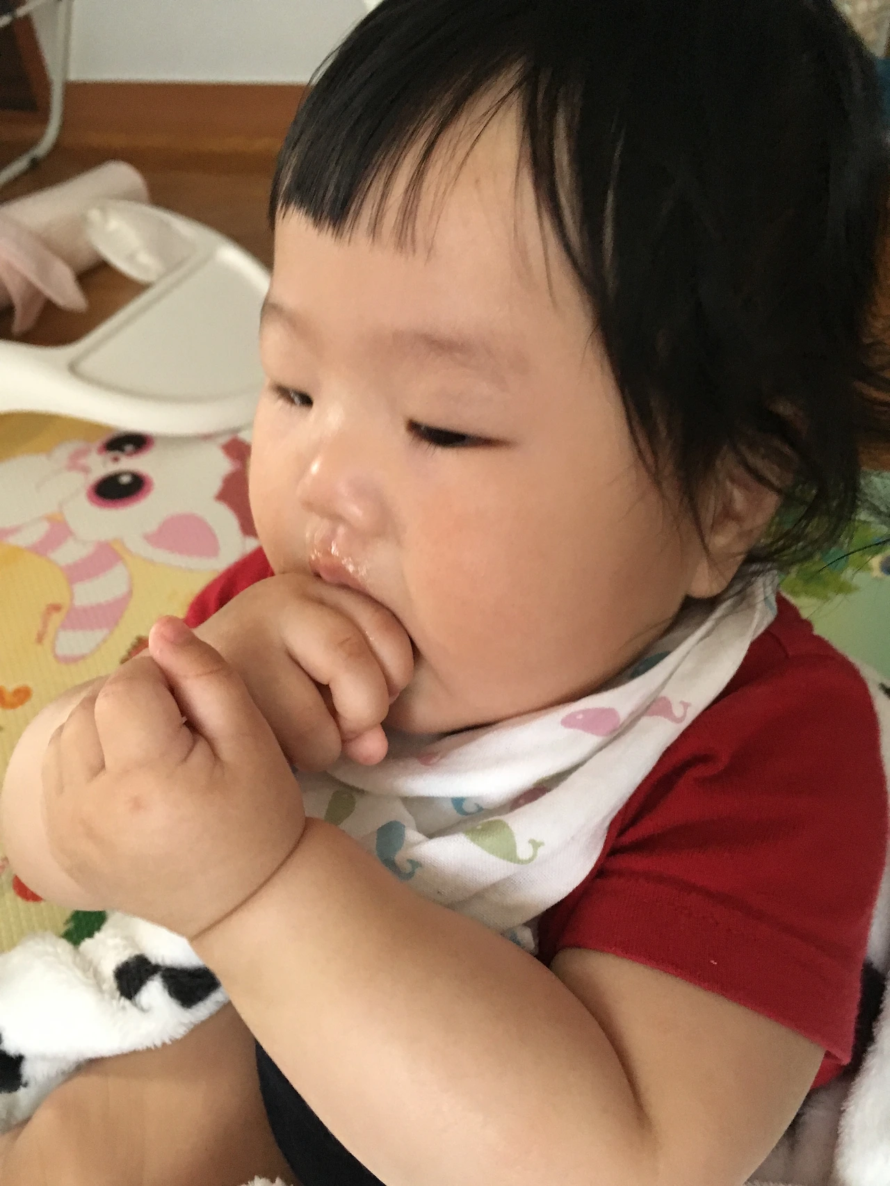 과자 대신 조금 알 굵은 사과를 손이 쥐어주었다. 처음에는 쳐다만 보더니 입으로 직행. 아직 씹을 수 없기에 치발기처럼 이리저리 입속에서 오물거렸다. 그리고는 환상적인 단맛에 살짝 놀라는 듯했다. 식사를 멈추고 시아를 지켜봐야 했다. 혹시라도 사과를 삼키면 목에 걸릴 수 있기 때문이다. 결국 식탁은 모두가 행복하게 되었다. 시아는 사과 맛을 알았고 이제 단맛의 세계가 펼쳐지겠지?