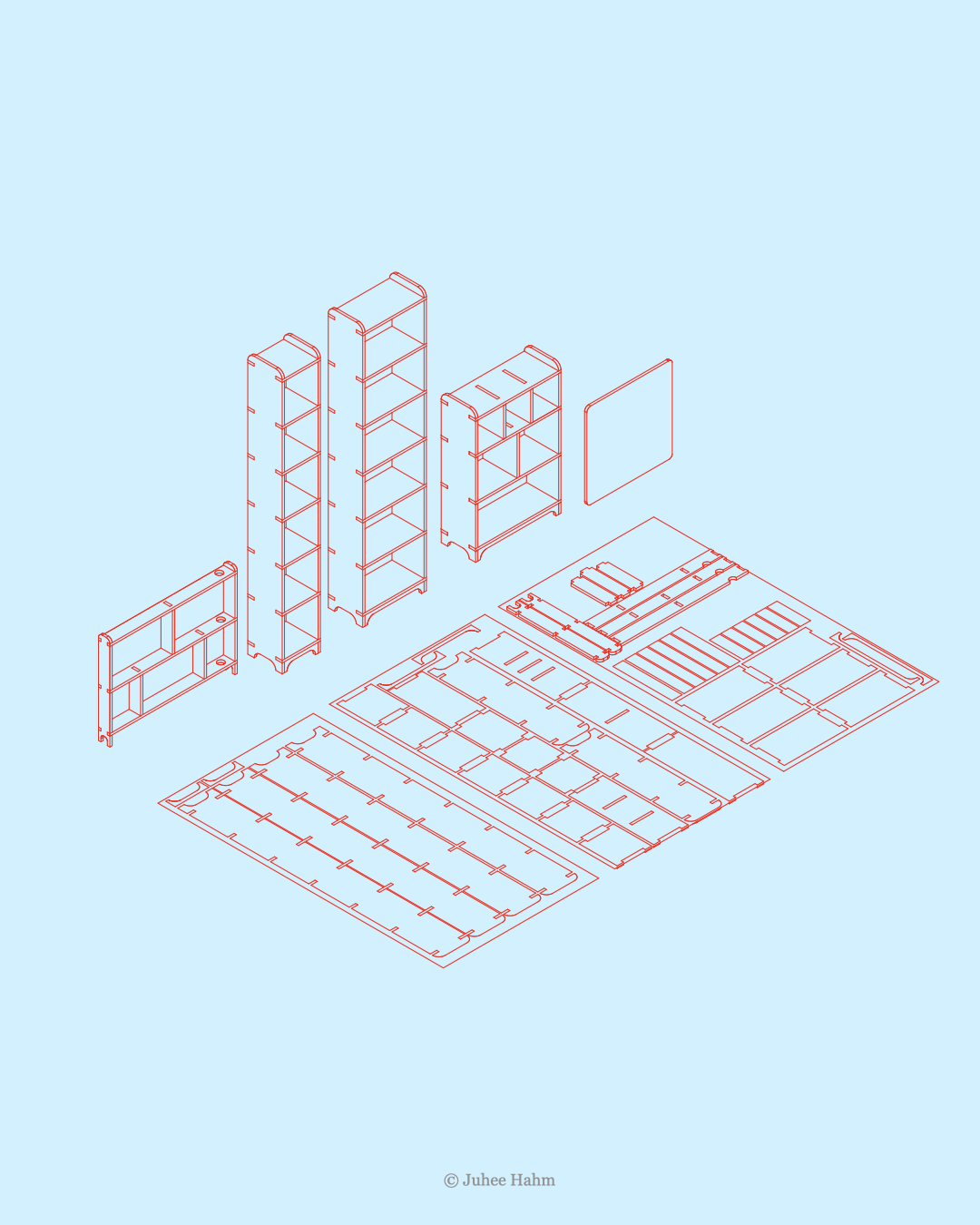 제작방법: 조금은 게으르고 가공을 최소화할 수 있는, 합판 CNC 커팅 방식*으로 나머지 책장을 만들기로 했다.