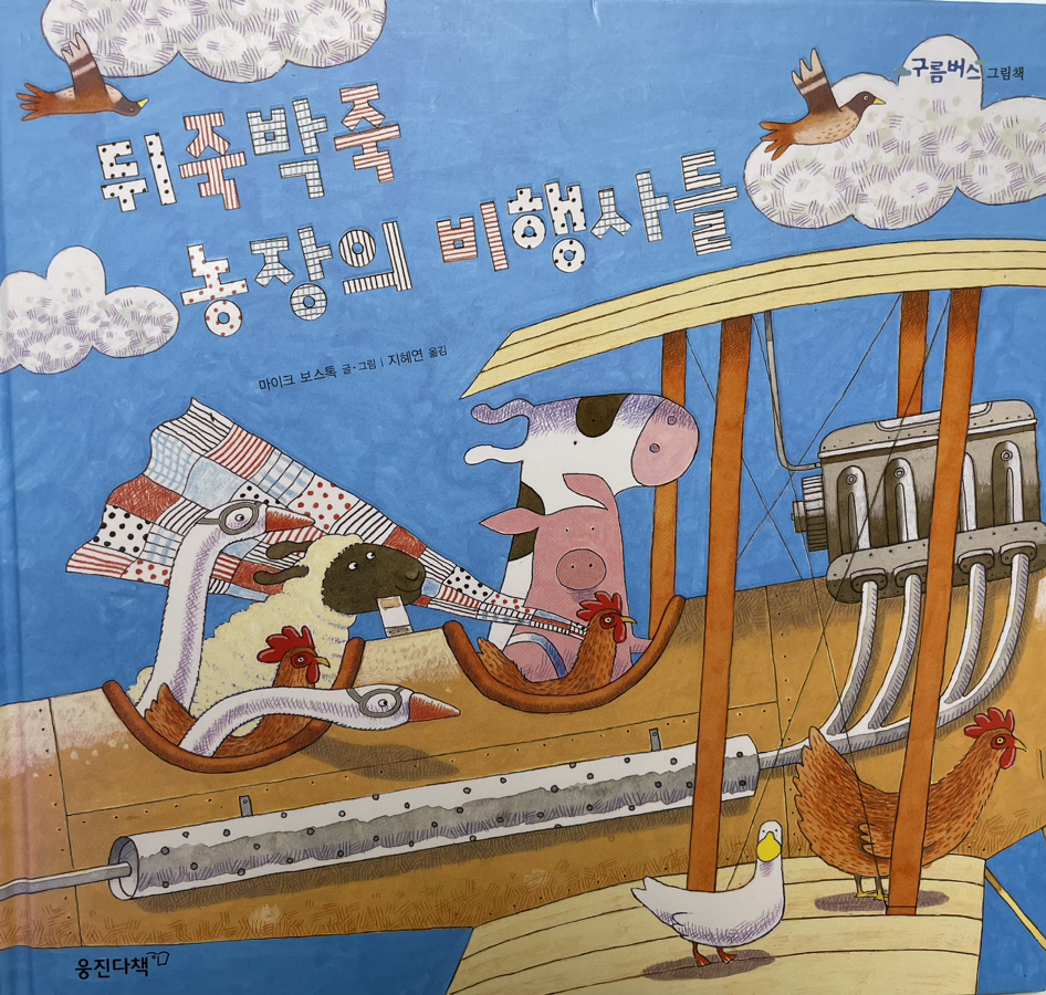 일단, 앞표지부터 감상한다. "귀여워-!"라는 말이 절로 나오는 것을 참고 사뭇 진지하게 앞으로 어떤 일들이 펼쳐질지 예상해 본다. 그 제목에 걸맞게 푸른 하늘을 배경으로 농장에 있어야 할 동물들이 비행기를 타고 어딘가로 날아가고 있다. '뒤죽박죽'이라는 제목의 단어처럼, 비행기 옆을 나는 비둘기 중 한 마리는 거꾸로 하늘을 날고 있다.
