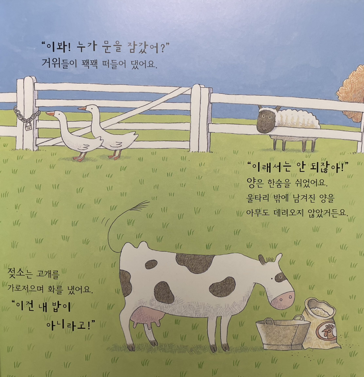 아무도 데려오지 않아 울타리 밖에 남겨진 양은 울타리 사이로 얼굴을 내밀고 있다. 오리 두 마리는 굳건히 잠긴 자물쇠를 바라보고 있고, "이건 내 밥이 아니라고!" 외치는 젖소 앞에 깨알같이 닭 그림이 그려진 사료가 놓여 있다. 동물들의 얼굴에 큰 표정 변화는 없다. 하지만 대사 때문일까, 멀뚱히 서 있는 모습에서 그들의 황망함이 느껴지는 듯하다.